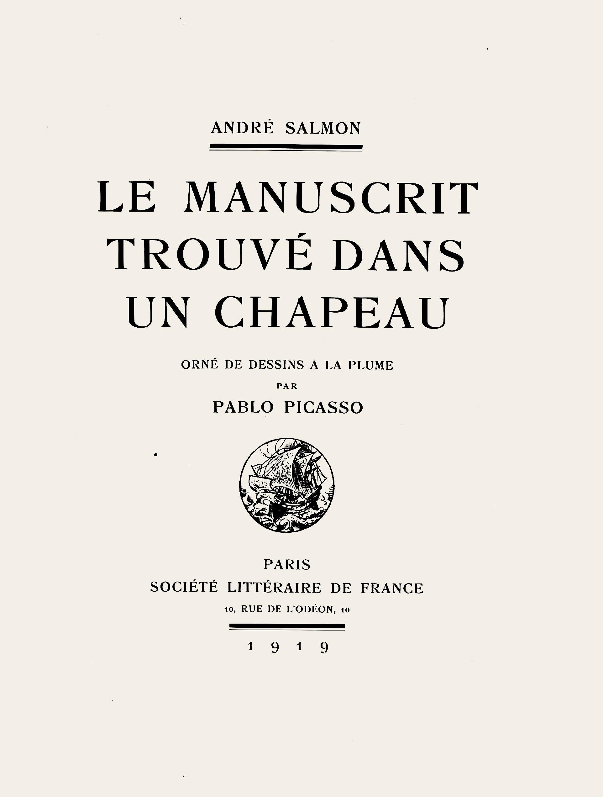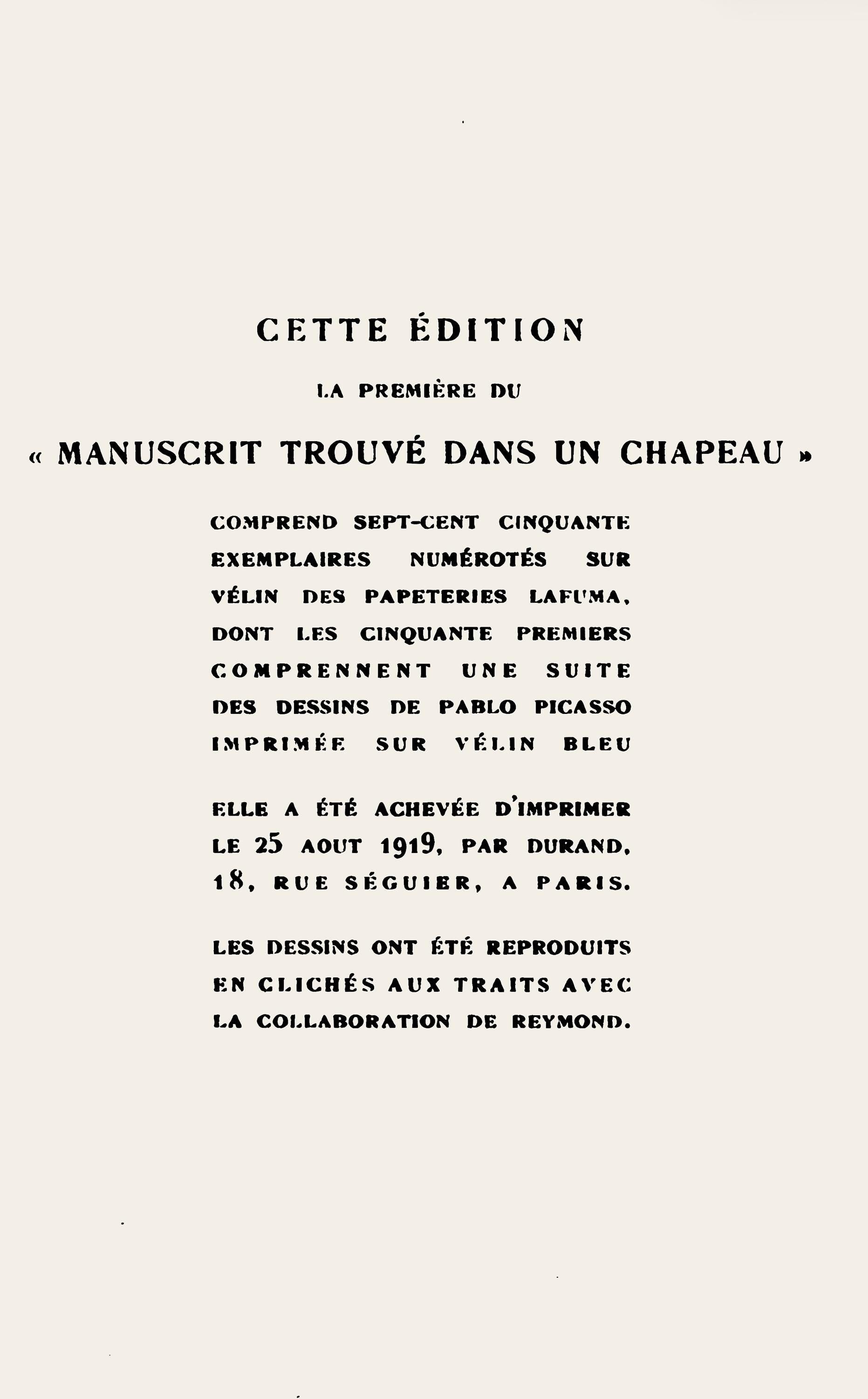 Excerpted from the album (translated from French), This edition, the first edition of Manuscrit trouv dans un chapeau, includes DCCL numbered examples on vlin des papeteries Lafma, whose first L examples include a sequel of Pablo Picasso's drawings printed on vlin bleu.