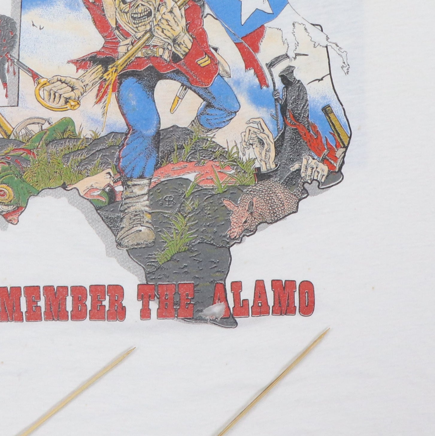 Original vintage 1983 Iron Maiden Remember The Alamo Tour Jersey Shirt. This is a true vintage shirt, not a modern reproduction. Sizes vary so please use measurements for best idea on fit. Front and back graphics. Shirt is in good condition, holes throughout, slight discoloration. This shirt will arrive washed and ready to wear.