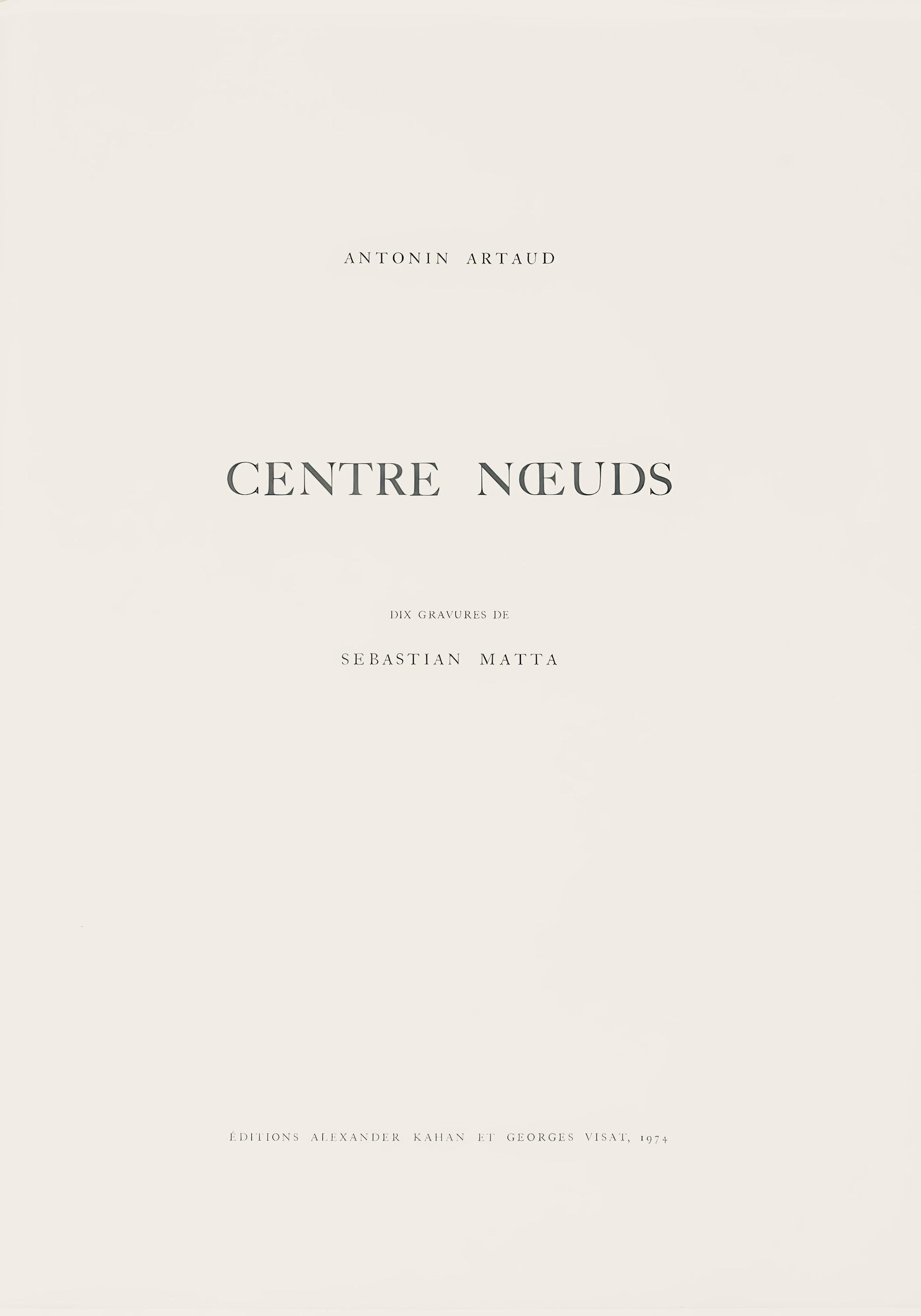 Excerpted from the folio (translated from French), The unpublished poem by Antonin Artaud and the X engravings by Sebastin Matta were printed on vlin d'Arches in CXXV examples, numbered from I to CXXV, and XV examples, out of trade, numbered from I to XV.