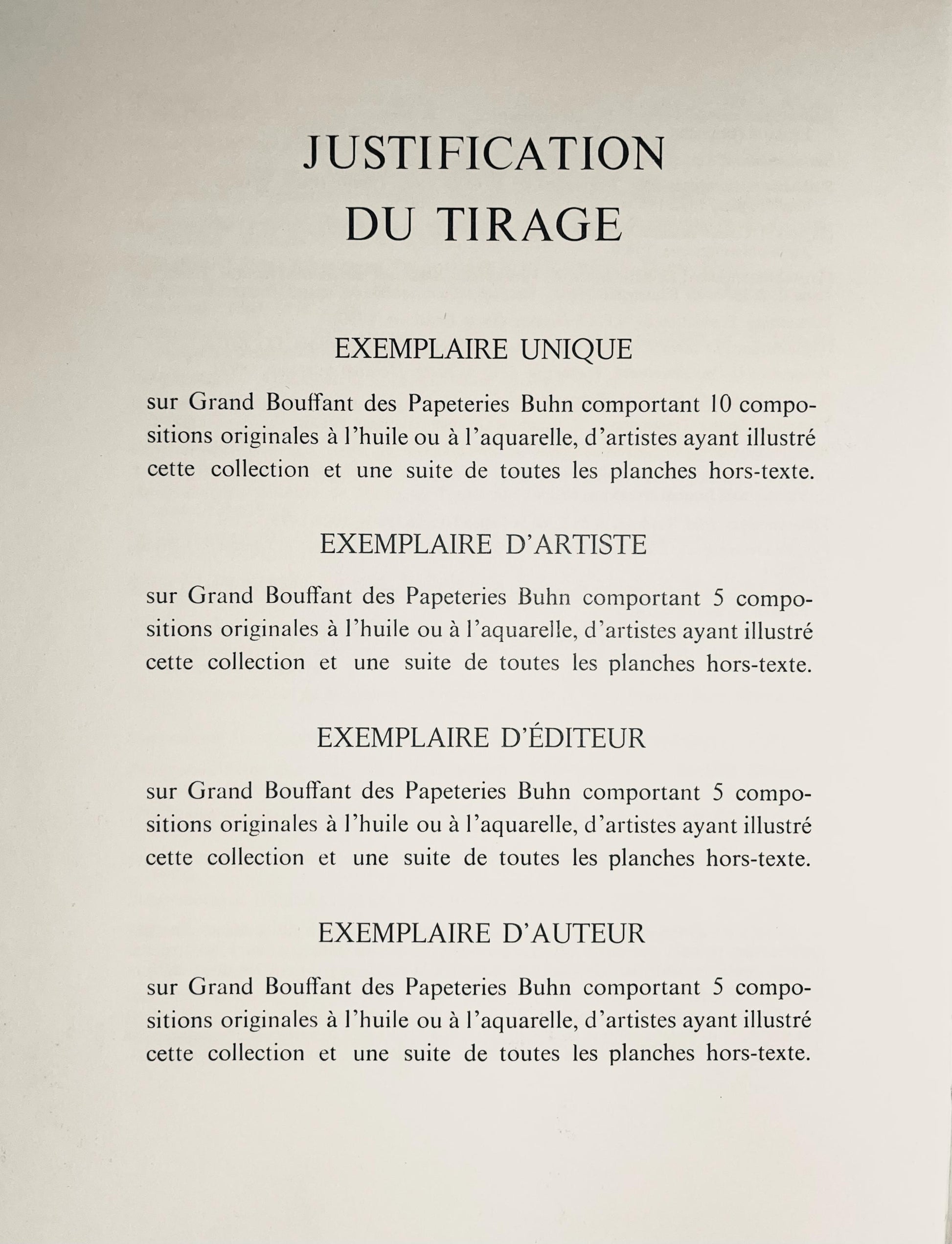 Justification du tirageExample unique, on Grand Bouffant des Papeteries Buhn with X original compositions in oil or watercolor, by artists who have illustrated this collection and a suite of all the off-text plates; Artists example, on Grand Bouffant des Papeteries Buhn with V original compositions in oil or watercolor, by artists who have illustrated this collection and a suite of all the off-text plates; Editors example, on Grand Bouffant des Papeteries Buhn with V original compositions in oil or watercolor, by artists who have illustrated this collection and a suite of all the off-text plates; Authors example, on Grand Bouffant des Papeteries Buhn with V original compositions in oil or watercolor, by artists who have illustrated this collection and a suite of all the off-text plates; XXXII examples, on Grand Bouffant des Papeteries Buhn with II original watercolors by artists who have illustrated this collection and a suite of all the off-text plates.