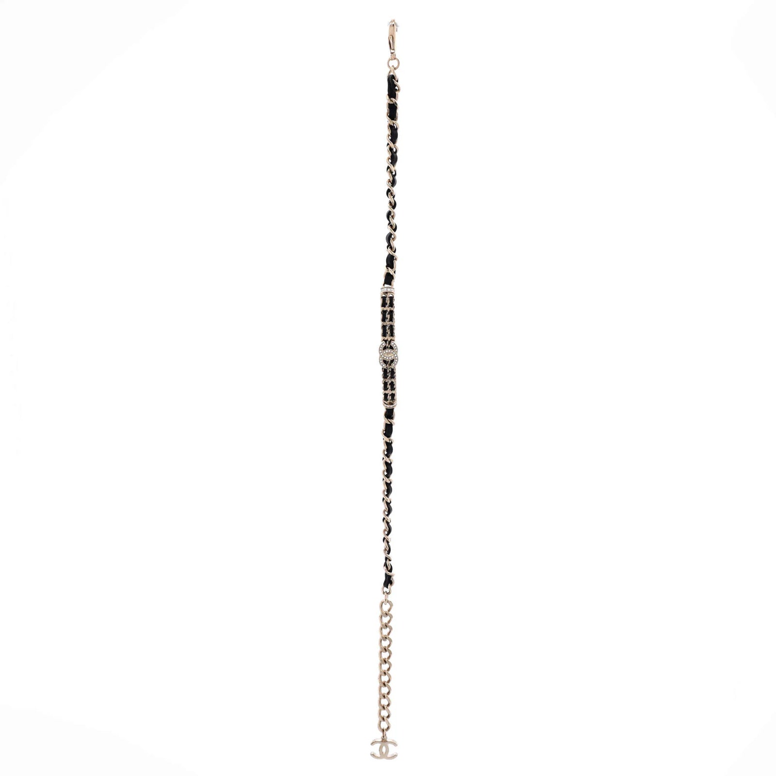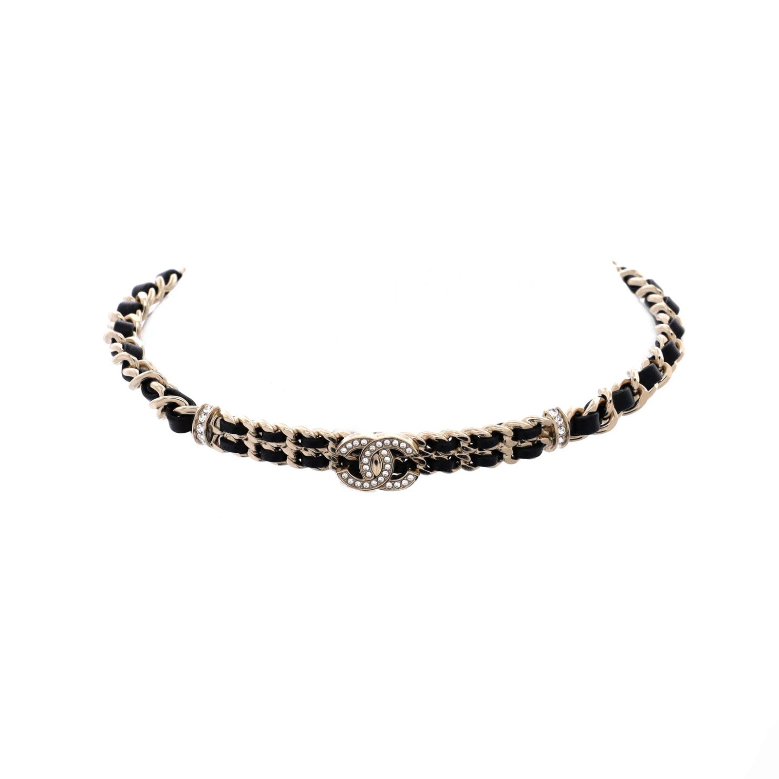Chanel Crystal Cc Double Chain Choker Necklace Metal With Crystal And Leather