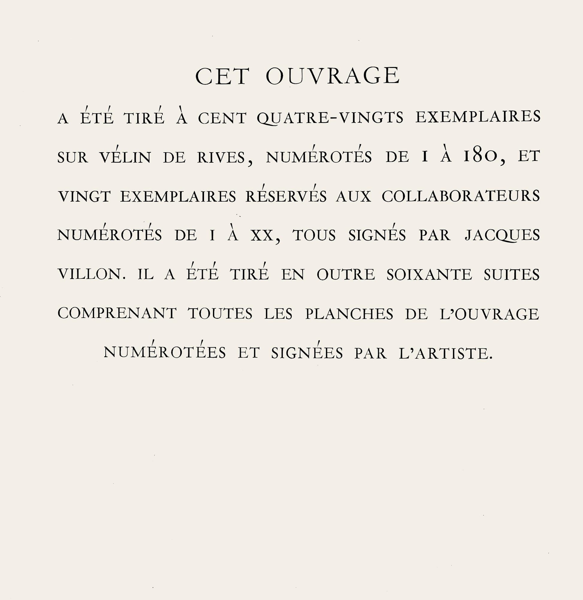 This portfolio was drawn in one hundred and eighty examples on vlin de Rives, numbered from 1 to 180, and twenty examples reserved for employees numbered from I to XX, all signed by Jacques Villon. It was also drawn sixty suites including all the boards of the portfolio, numbered and signed by the artist.