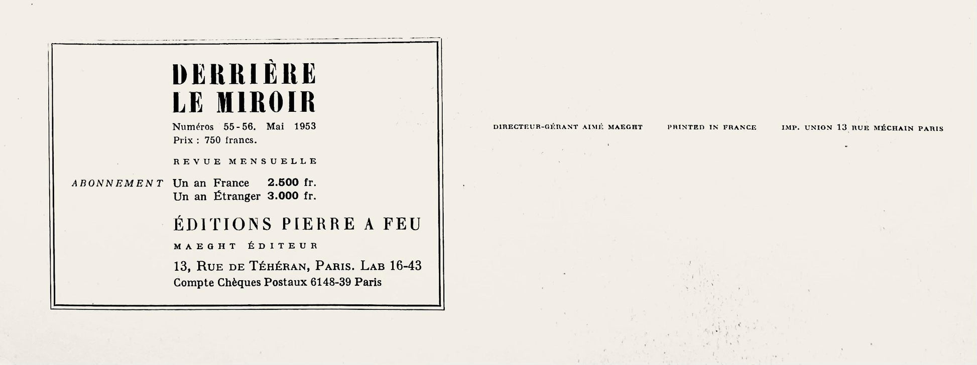 Aim Maeght, initiator of Derrire le Miroir, had already made few attempts to start publications illustrated with fine printed lithographs in colours in the years prior to the launch of Derrire le Miroir.