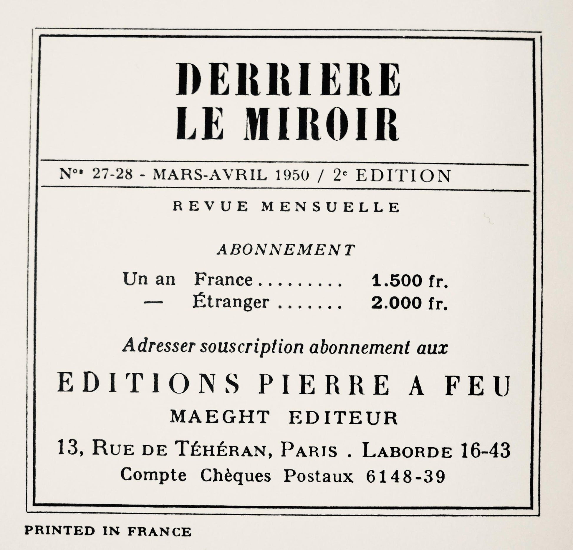 The name, Derrire le Miroir was suggested by Jacques Kober, manager of Galerie Maeght.