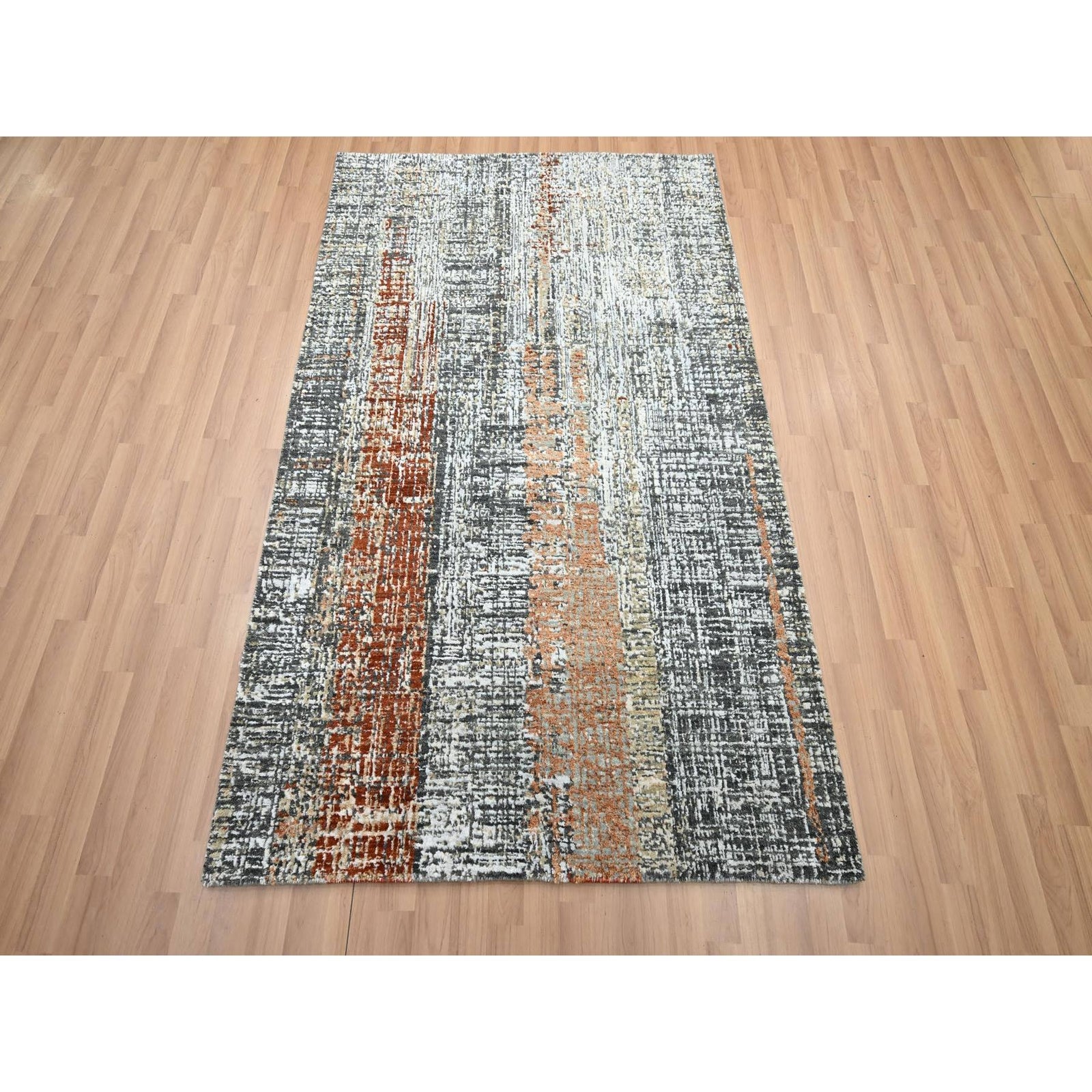 4'1"X6'3" Gray With Rust Hand Knotted Abstract Galaxy Design All Wool Rug