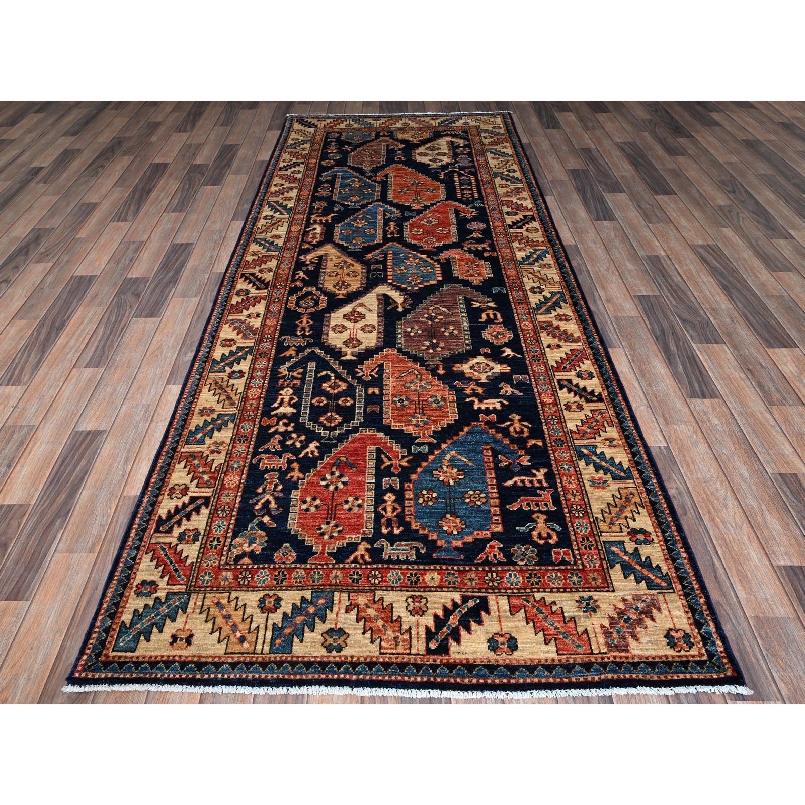 4'X9'9" Midnight Blue Large Paisley Design Wool Hand Knotted Runner Rug