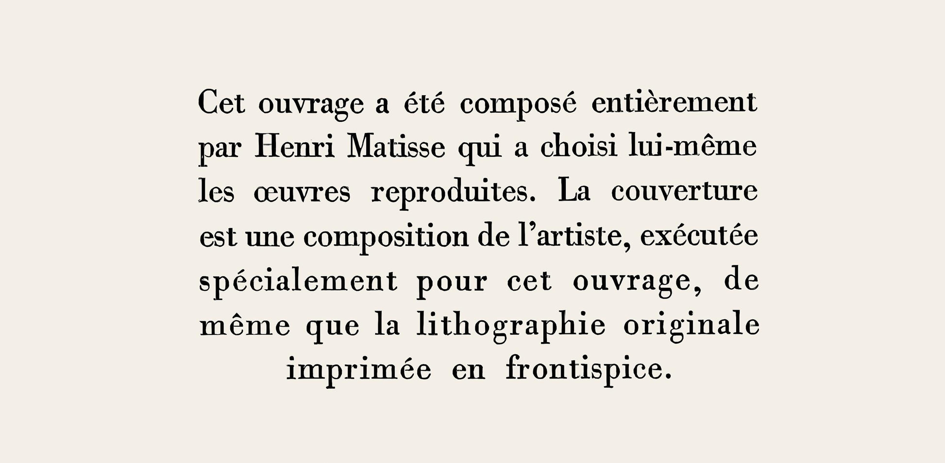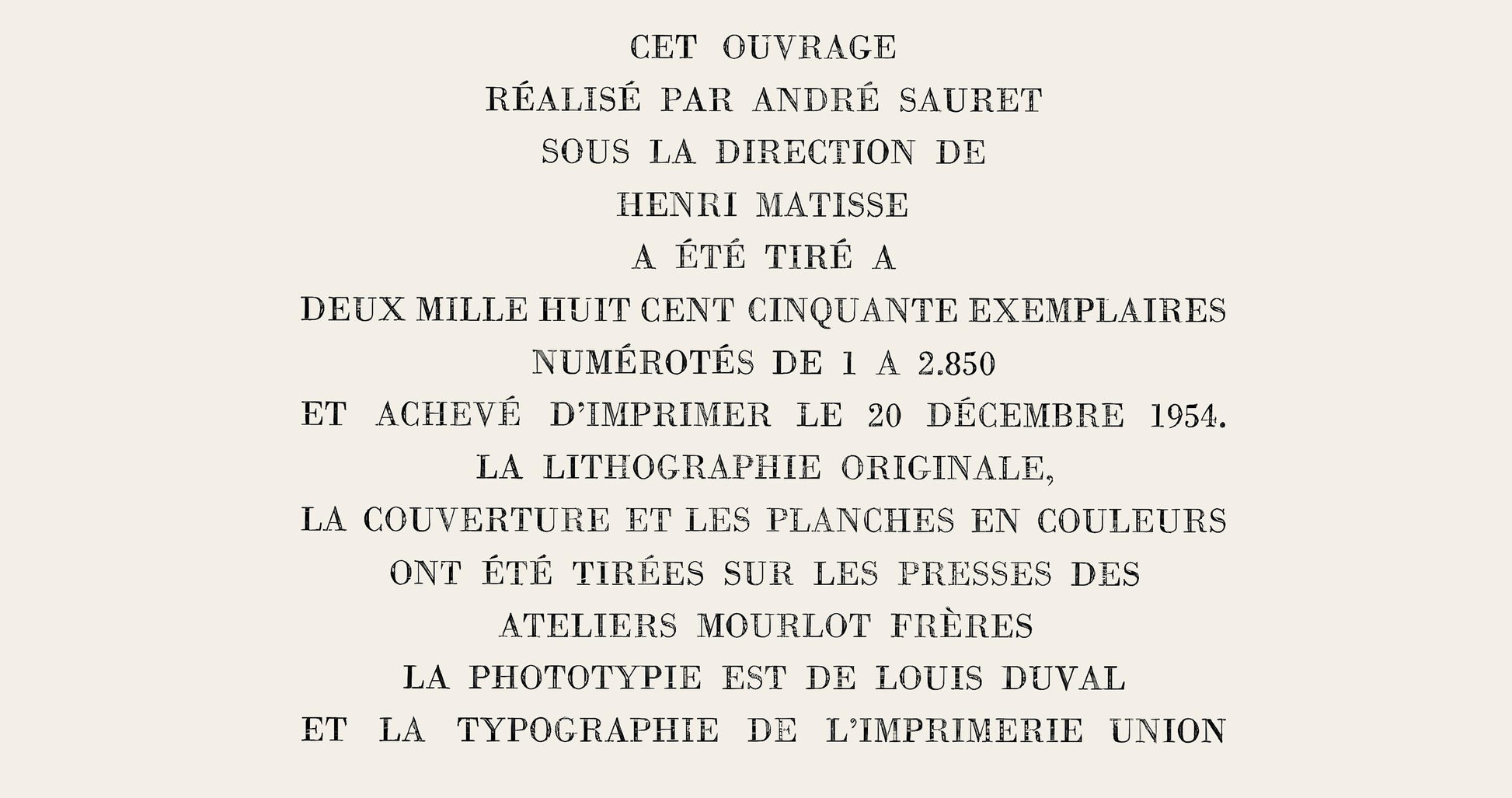 This album, directed by Andr Sauret, under the direction of Henri Matisse, was drawn to MMDCCCL examples, numbered from I to MMDCCCL, and completed printing on December 20, 1954. The original lithography, the cover and the color plates were drawn on the presses of the Mourlot Frres workshops; the phototypie is by Louis Duval; and, the typography of L'Imprimerie Union.