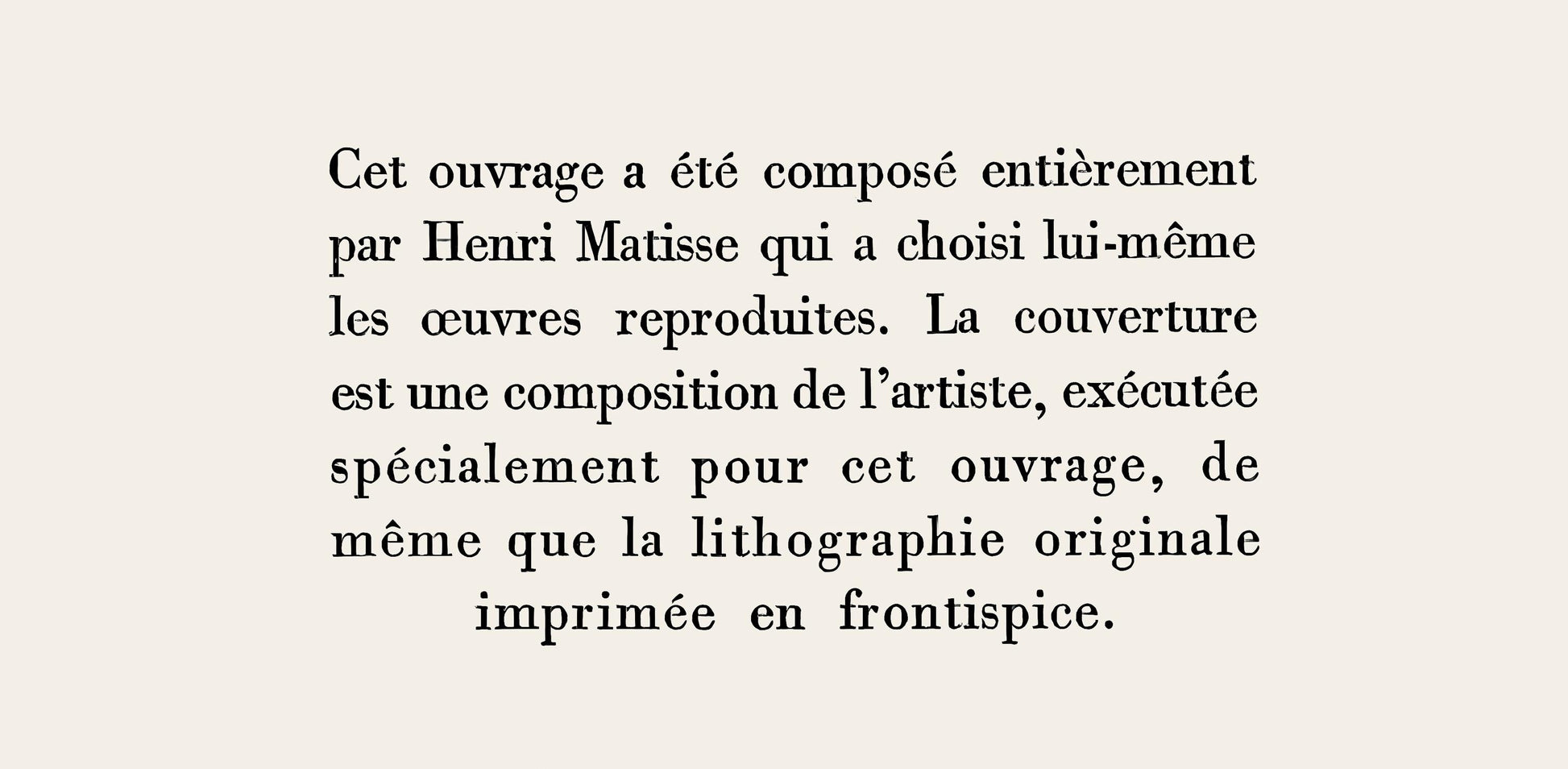 This album, directed by Andr Sauret, under the direction of Henri Matisse, was drawn to MMDCCCL examples, numbered from I to MMDCCCL, and completed printing on December 20, 1954. The original lithography, the cover and the color plates were drawn on the presses of the Mourlot Frres workshops; the phototypie is by Louis Duval; and, the typography of L'Imprimerie Union.