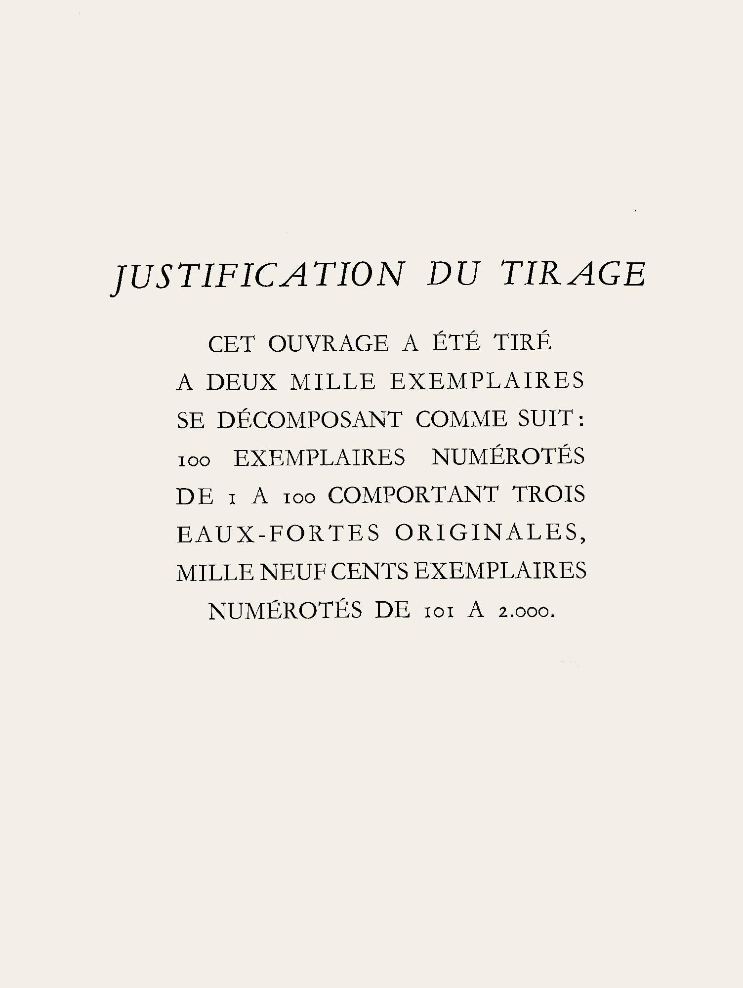 The original etchings attached to the C head examples were shot on Roger Lacourire's presses. Justification of the draw, this album was drawn in MM examples, decomposing as follows: C examples numbered from I to C with III original etchings, nineteen hundred numbered examples from CI to MM.