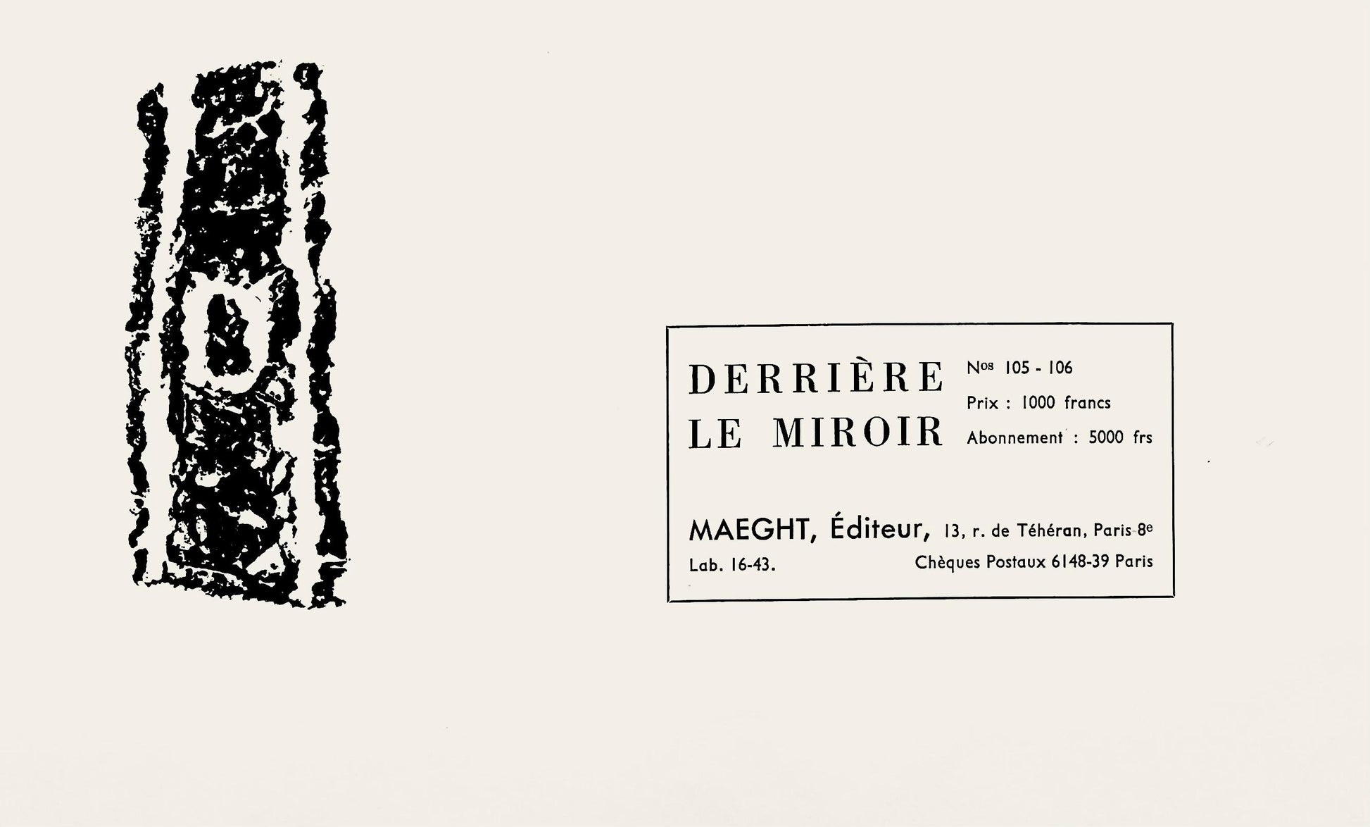 Aim Maeght, initiator of Derrire le Miroir, had already made few attempts to start publications illustrated with fine printed lithographs in colours in the years prior to the launch of Derrire le Miroir.