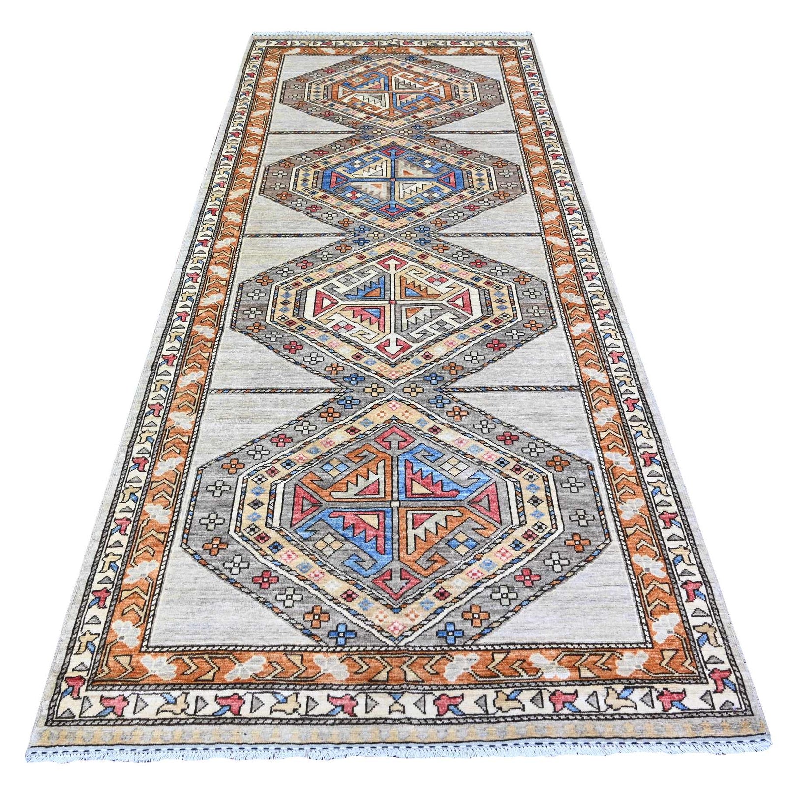 4'2"X9'9" Cloud Gray Hand Knotted Afghan Ersari Wide Runner Oriental Rug
