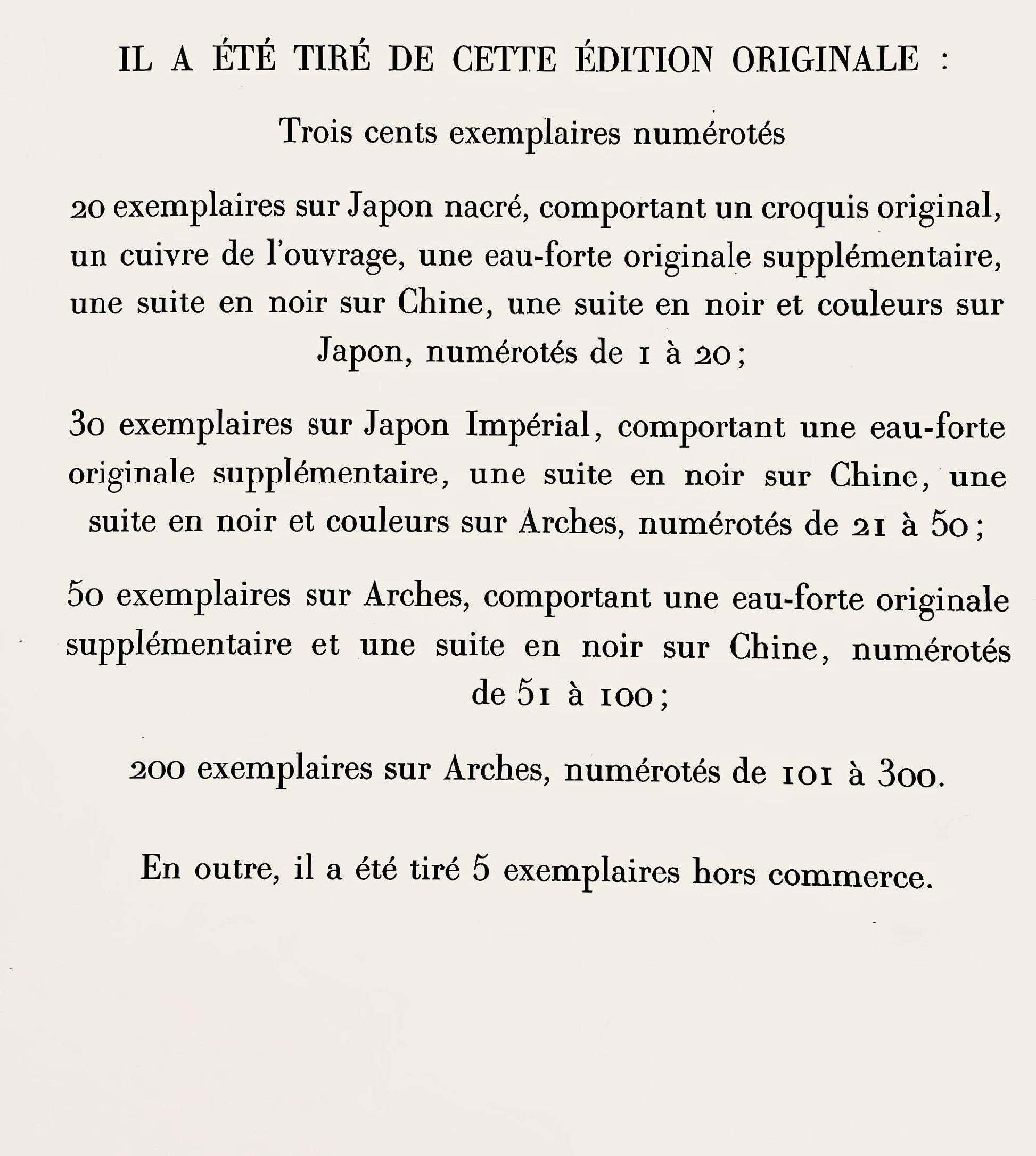 Excerpted from the folio (translated from French), It was taken from this original edition: Three hundred numbered examples; 20 examples on Japon nacr, including an original sketch, a copper of the book, an additional original etching, a suite en noir sur Chine, a suite in black and color on Japon, numbered from 1 to 20; 30 examples on Japon Imprial, including an additional original etching, a noir suite on Chine, a black and color suite on Arches, numbered from 21 to 50; 50 examples on Arches, including an additional original etching and a noir suite on Chine, numbered from 51 to 100; 200 examples on Arches, numbered from 101 to 300. In addition, 5 examples were printed out of the market.