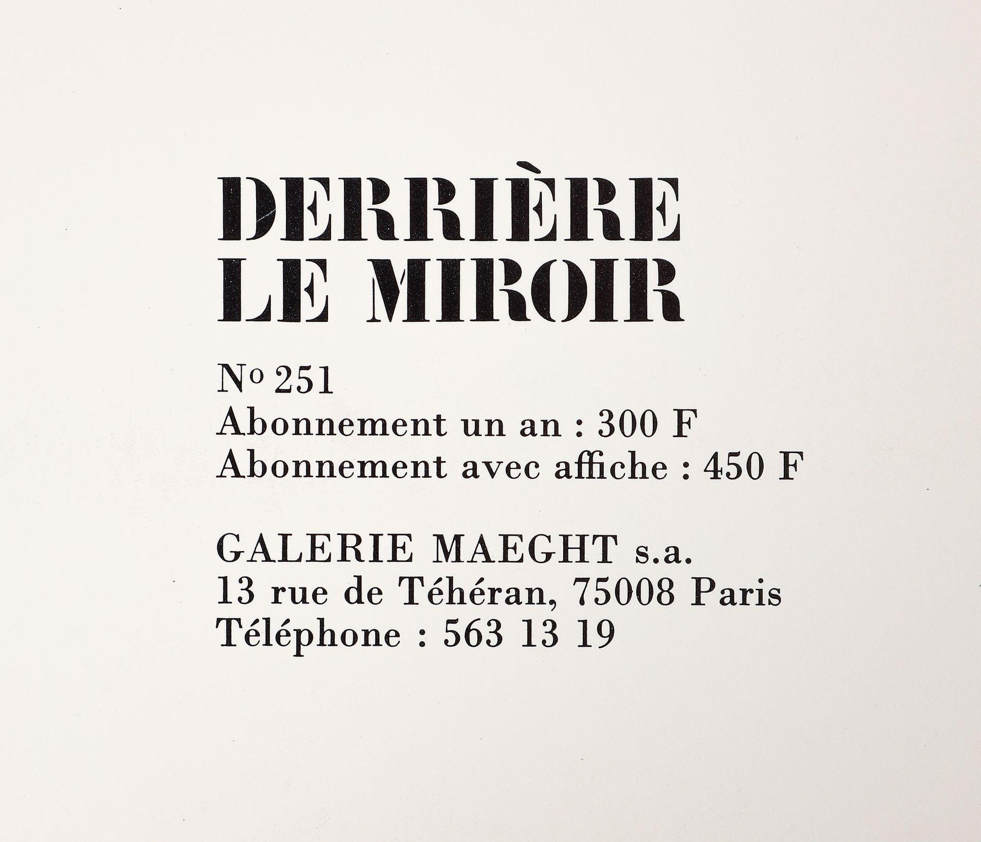 It was published after number 253 in 1982 and became a tribute to Aim and Margurite Maeght and 35 years of friendship with artists and poets. The era of Derrire le Miroir was closed with that final publication.