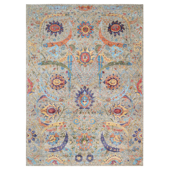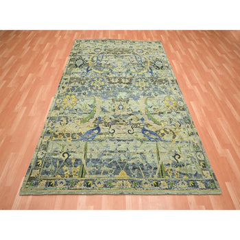 6'1"X9'3" Green Broken And Erased Birds Design Hand Knotted Pure Wool Rug