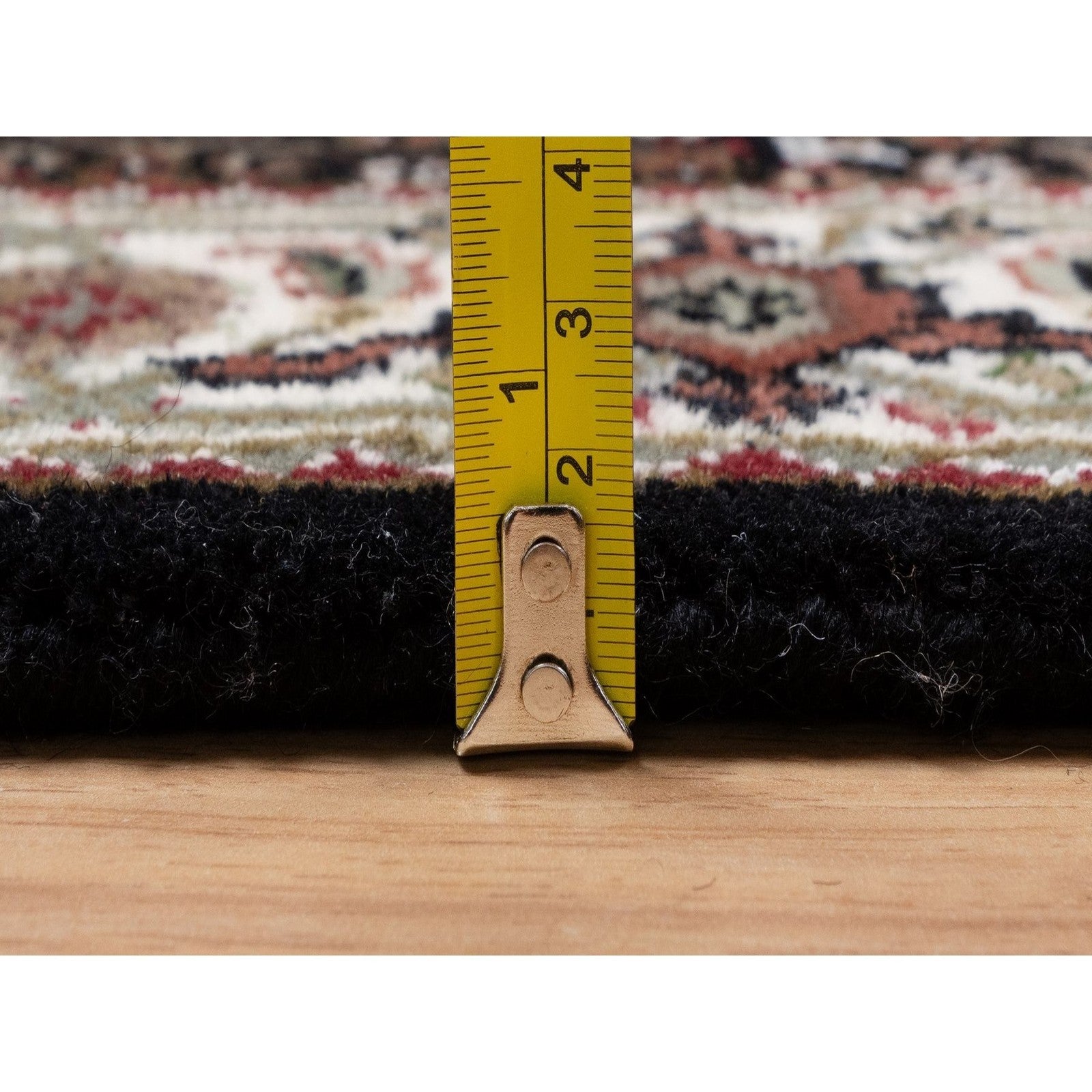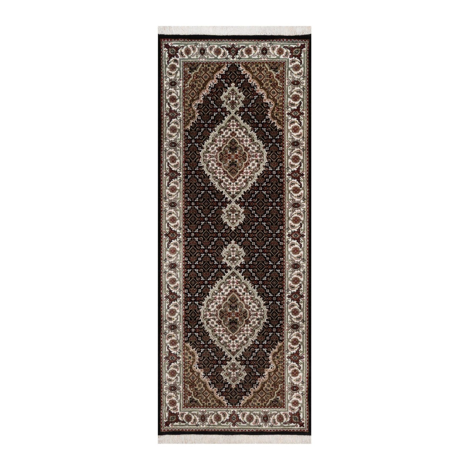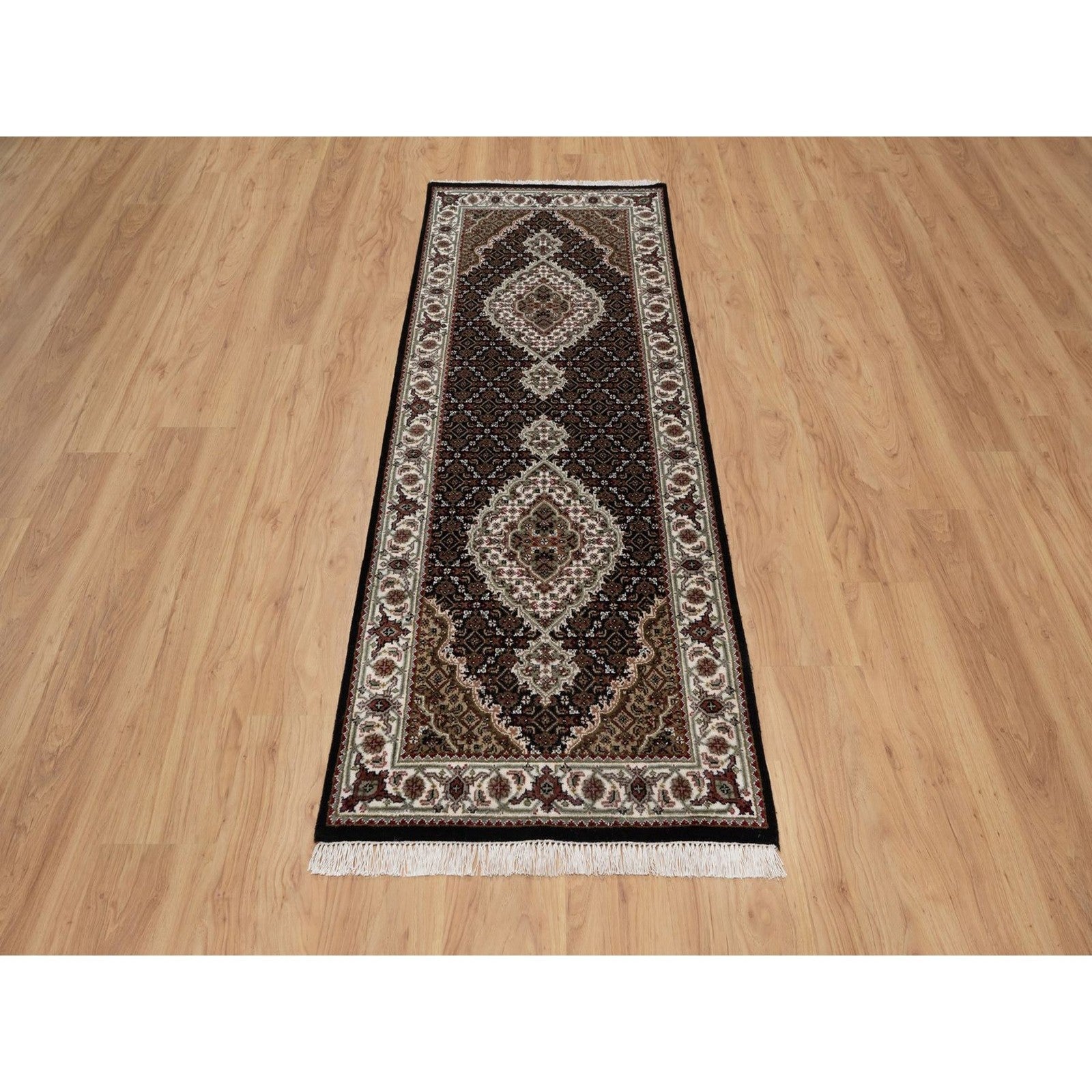 This listing features Runner 2'7"x6'9" Black Hand Knotted Rug Tebraz Mahi Medallion Design Wool. Item specifics are provided below.