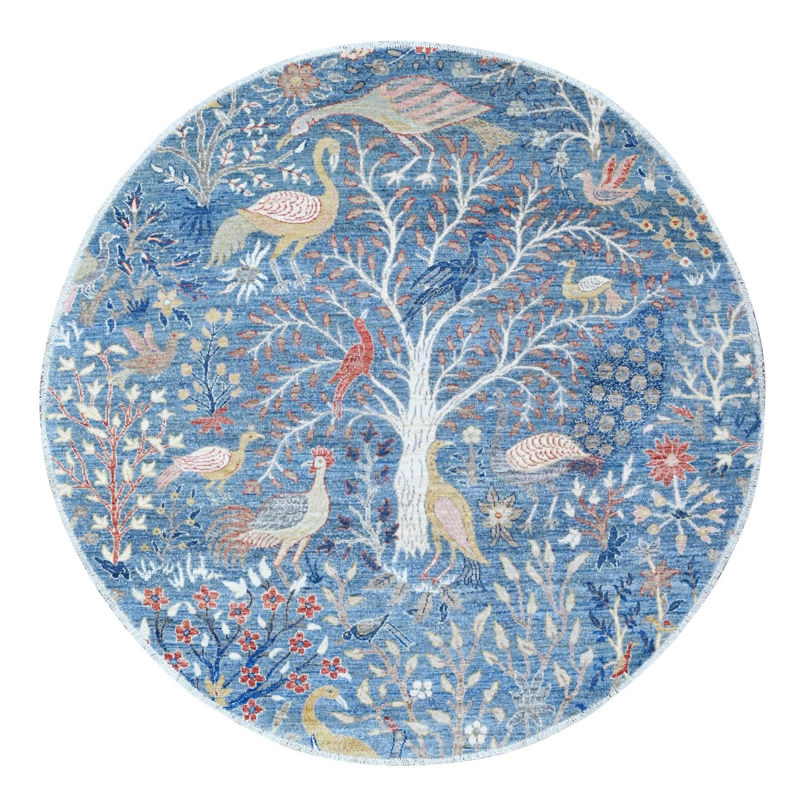 6'X6' Uranian Blue Wool Peshawar Birds Of Paradise Hand Knotted Round Rug