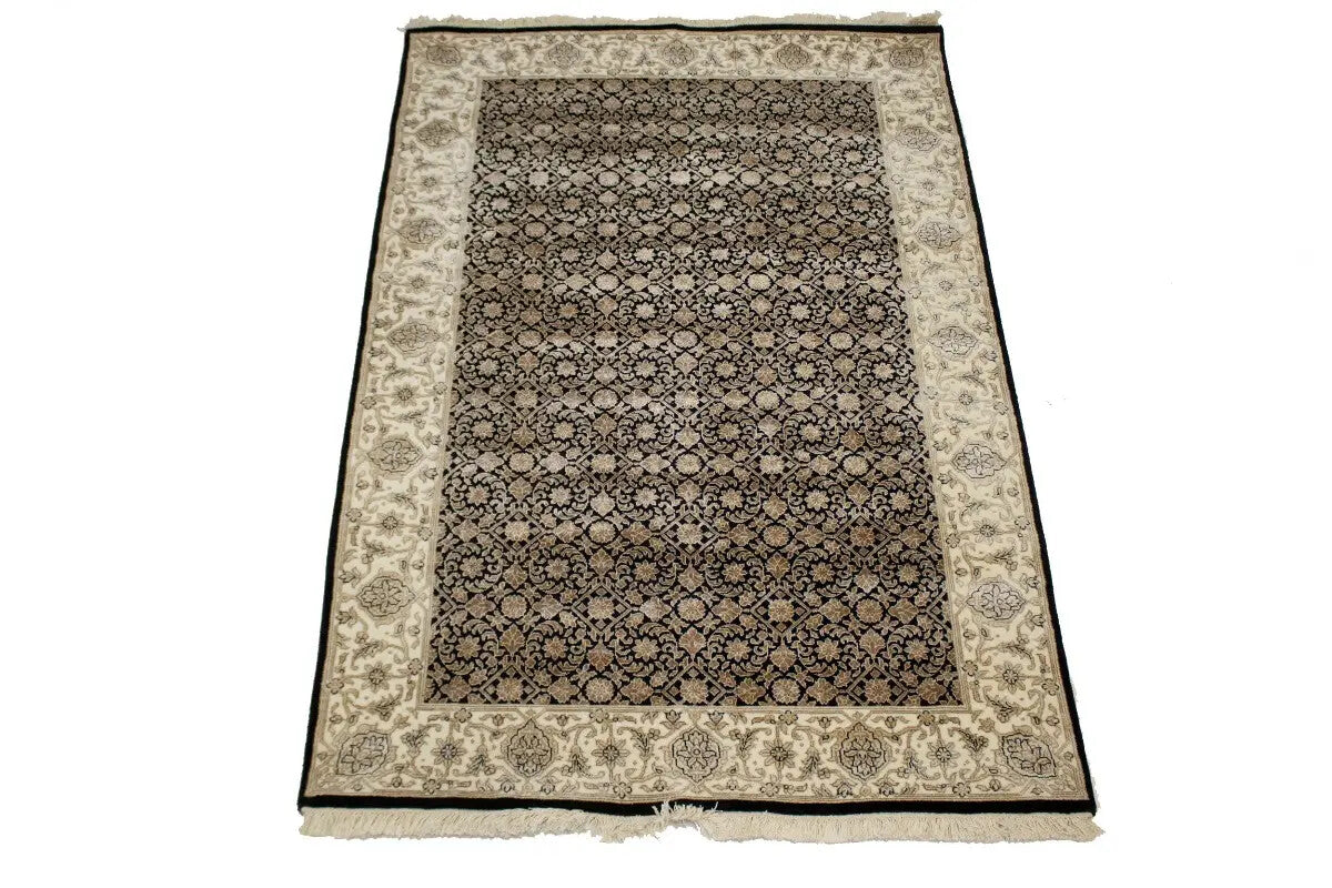 Extra fine Oriental rug measuring 4'1 x 6'1, hand-knotted in India with a floral design in black, cream, brown, and beige colors, boasting eco-friendly and pet-friendly features.