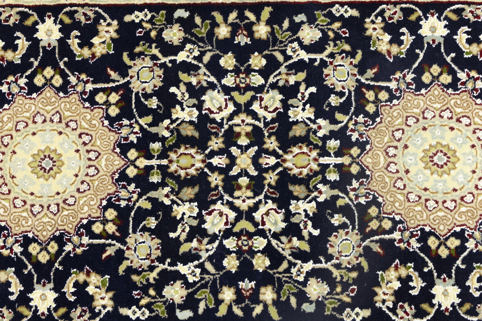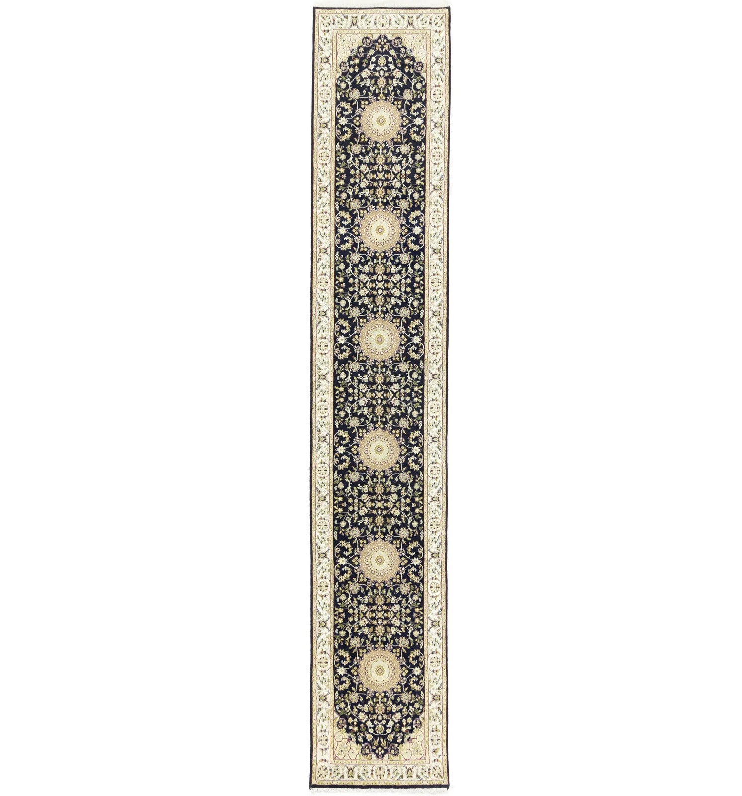 Indo-Nain oversized floral runner rug measuring 2'7 x 14'3, handmade from Kork wool and silk, featuring dark navy and cream colors, and allergy-friendly properties.