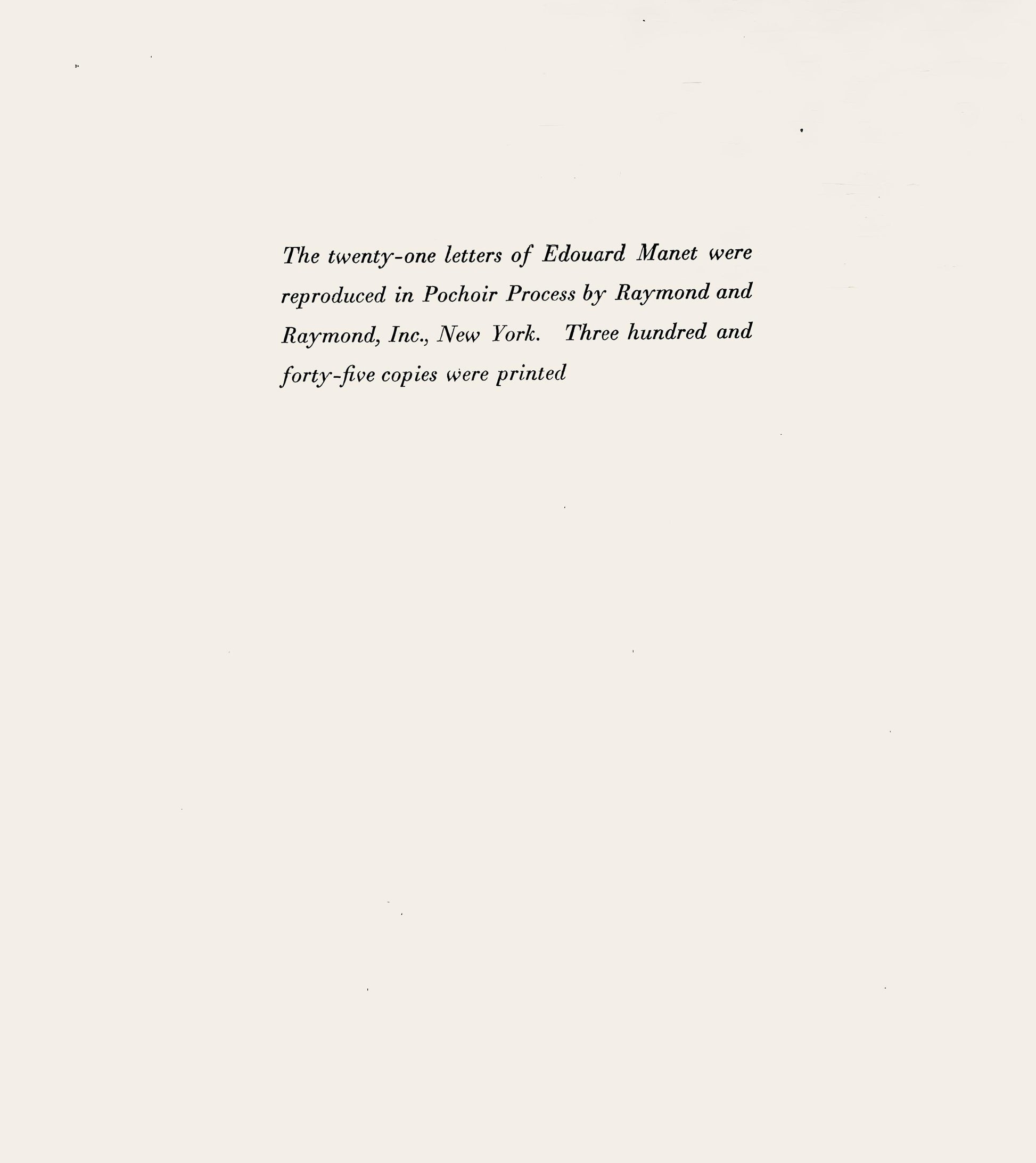 Excerpted from the folio, The twenty-one letters of douard Manet were reproduced in Pochoir Process by Raymond and Raymond, Inc., New York.