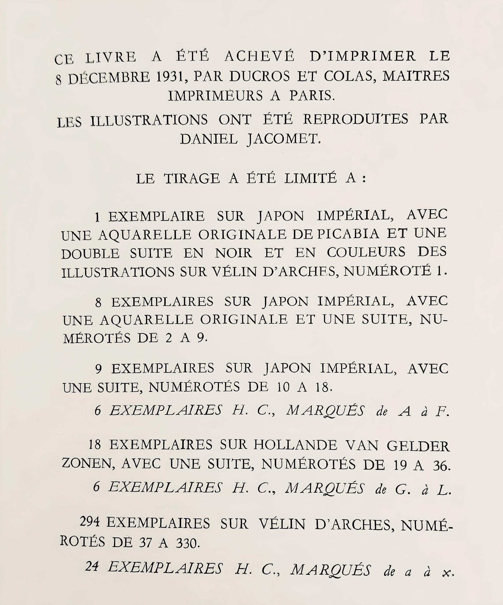 The draw has been limited to: I example on Japon Imprial, with an original watercolor of Picabia and a double suite in black and color of illustrations on vlin d'Arches, numbered I.