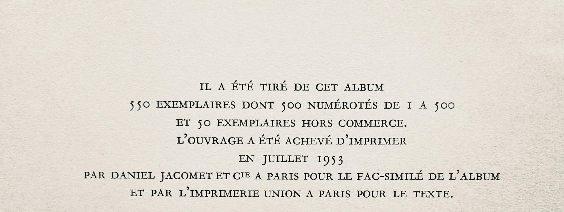 Excerpted from the album (translated from French), It was taken from this album DL examples including D numbered from I to D And L non-commerce examples. The album has been finished printing in July 1953 by Daniel Jacomet et Cie in Paris for the facsimile of the album and by limprimerie Union printing in Paris for the text.