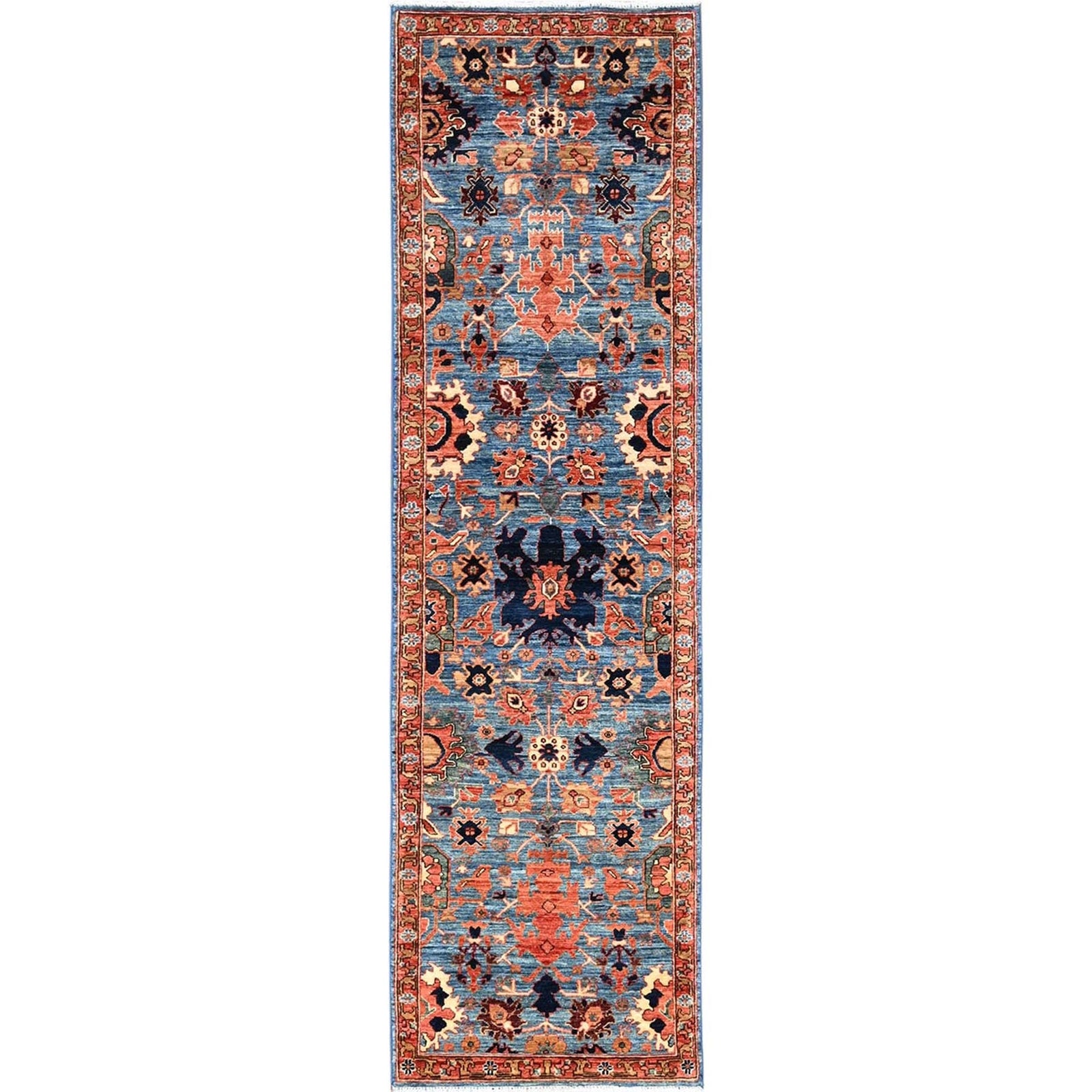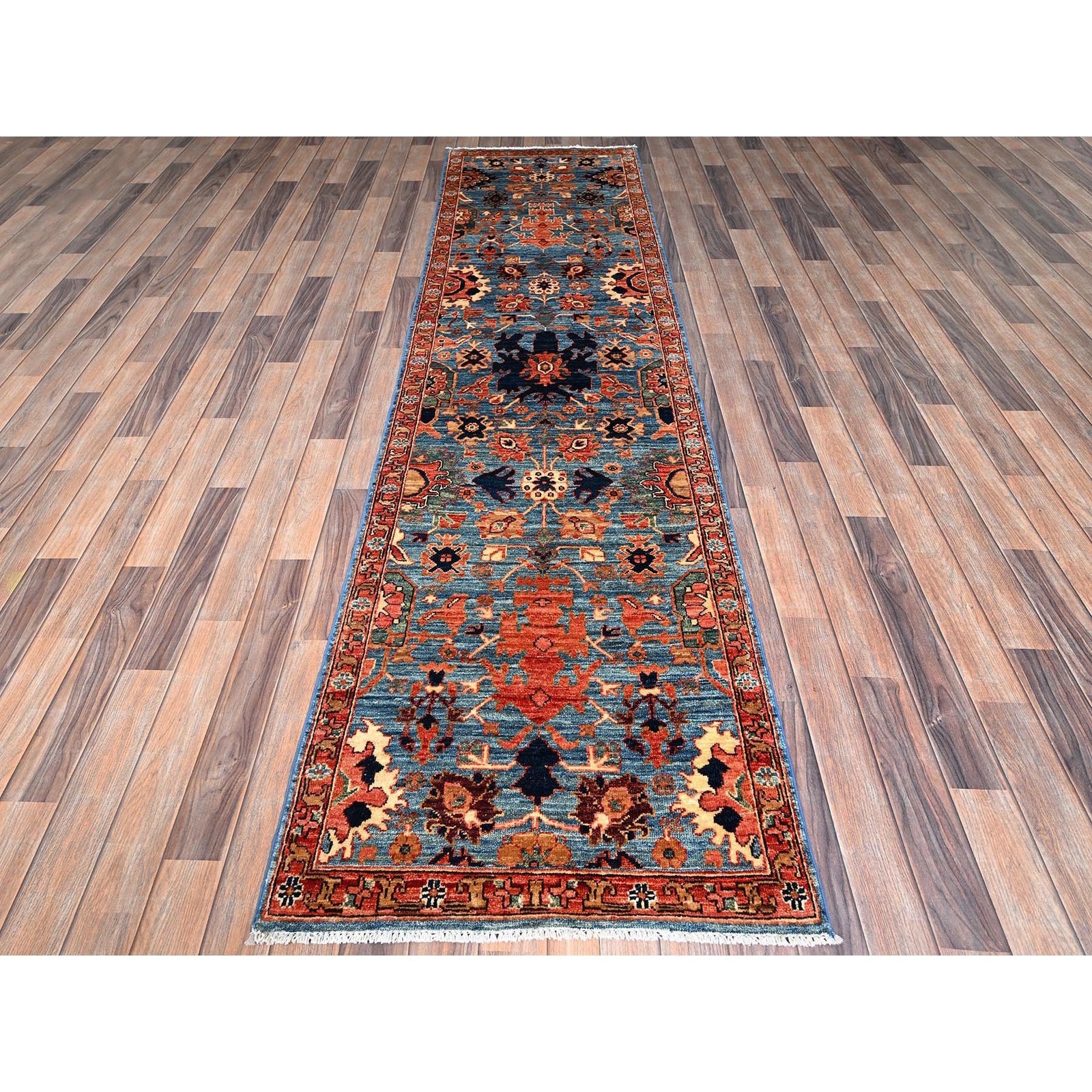2'7"X9'9" Blue Heris All Over Design Soft Wool Hand Knotted Runner Rug