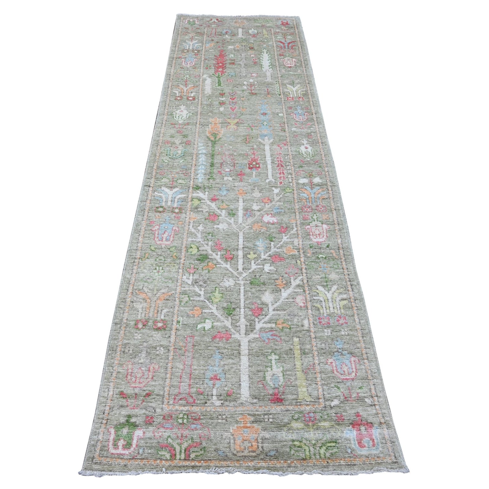 2'9"X9'10" Green Angora Oushak Tree Design Wool Hand Knotted Runner Rug