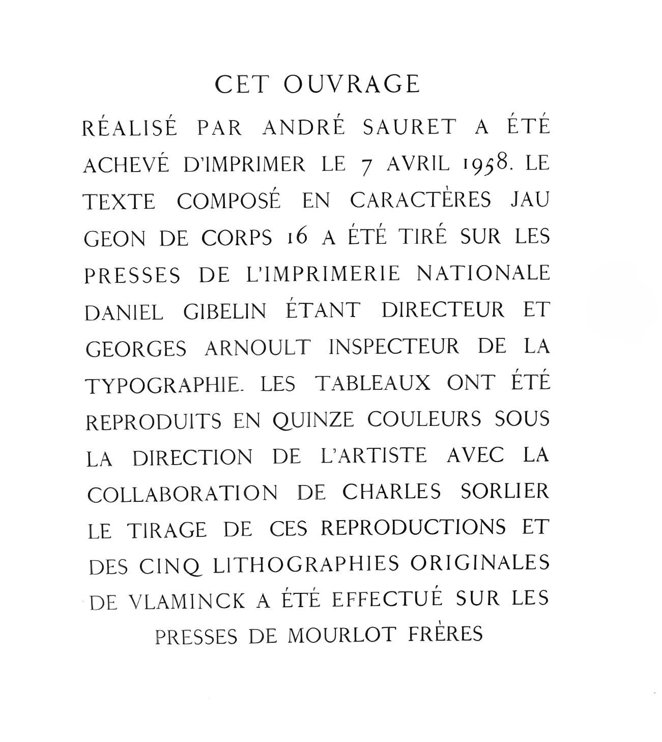 The paintings were lithographed in fifteen colors under the direction of the artist with the collaboration of Charles Sorlier. The print run of these lithographs, and the V original lithographies of Vlaminck, were shot on the presses of Mourlot Frres in an edition of MM.
