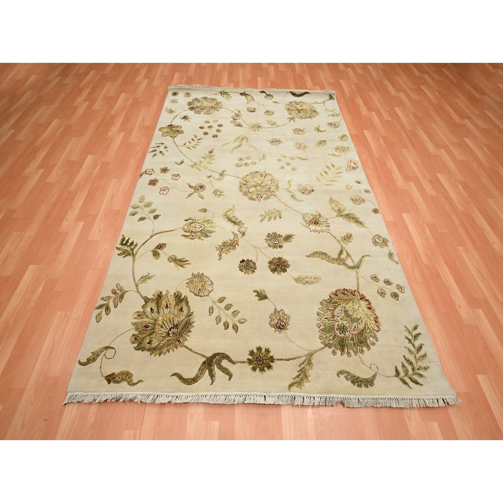 6'X9' Bone White Hand Knotted Botanical Design Wool And Silk Oriental Rug