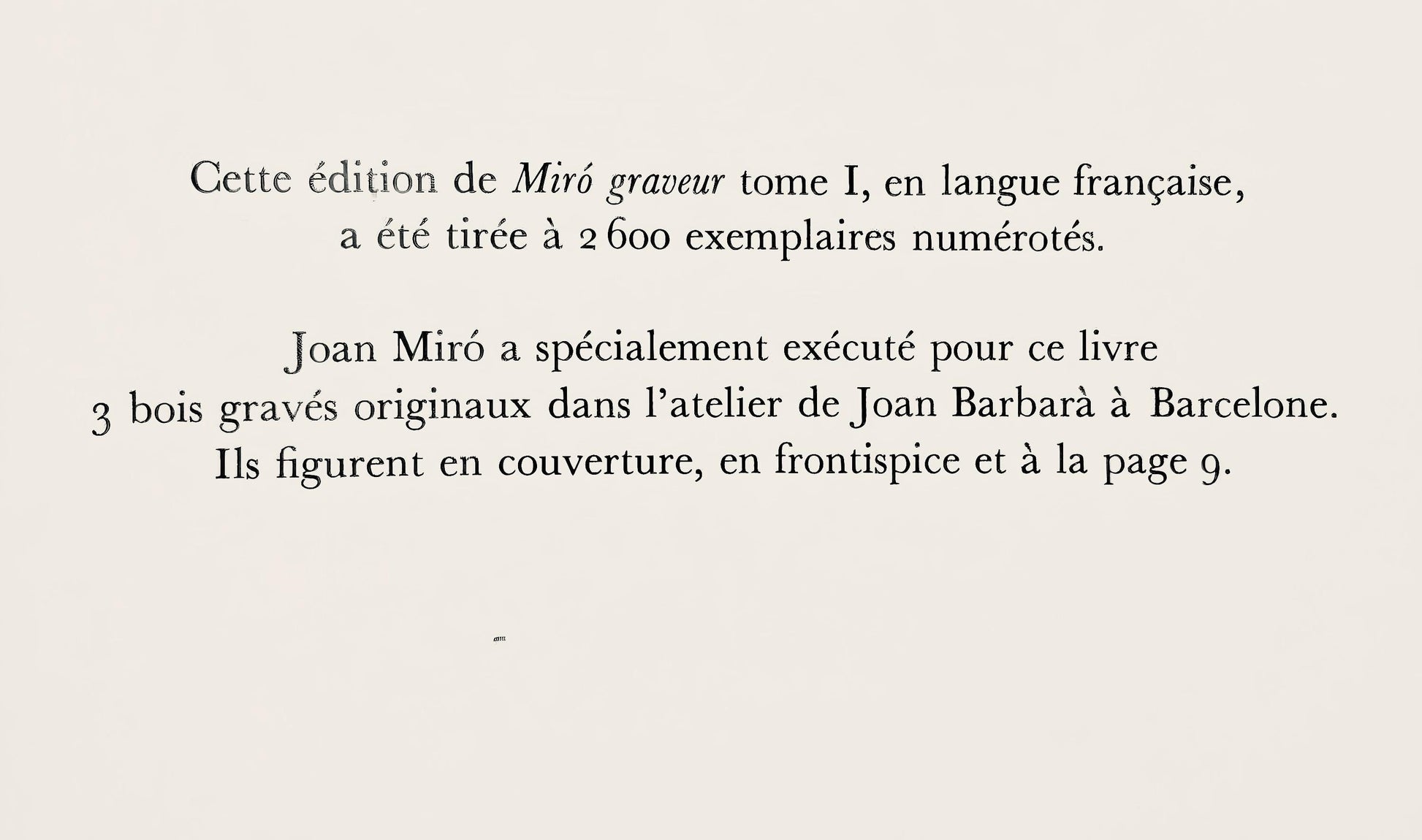 Joan Miro specially executed for this volume two original engraved woods in Joan Barbar's workshop in Barcelona. They appear on the cover, on the frontispiece, and on page nine.