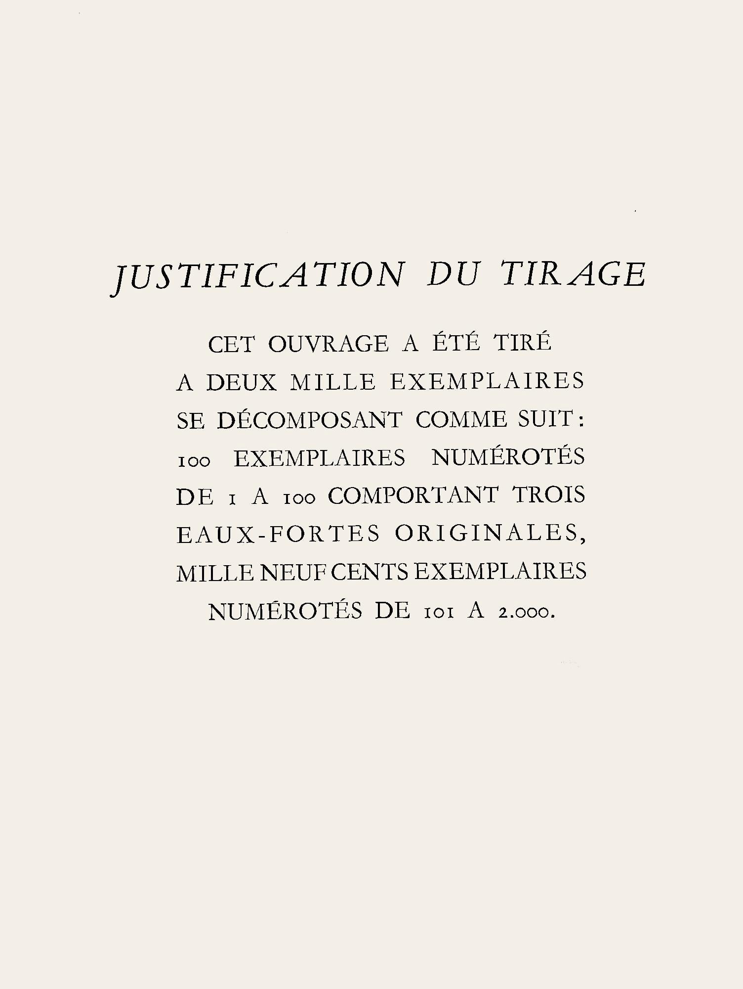 The original etchings attached to the C head examples were shot on Roger Lacourire's presses. Justification of the draw, this album was drawn in MM examples, decomposing as follows: C examples numbered from I to C with III original etchings, nineteen hundred numbered examples from CI to MM.