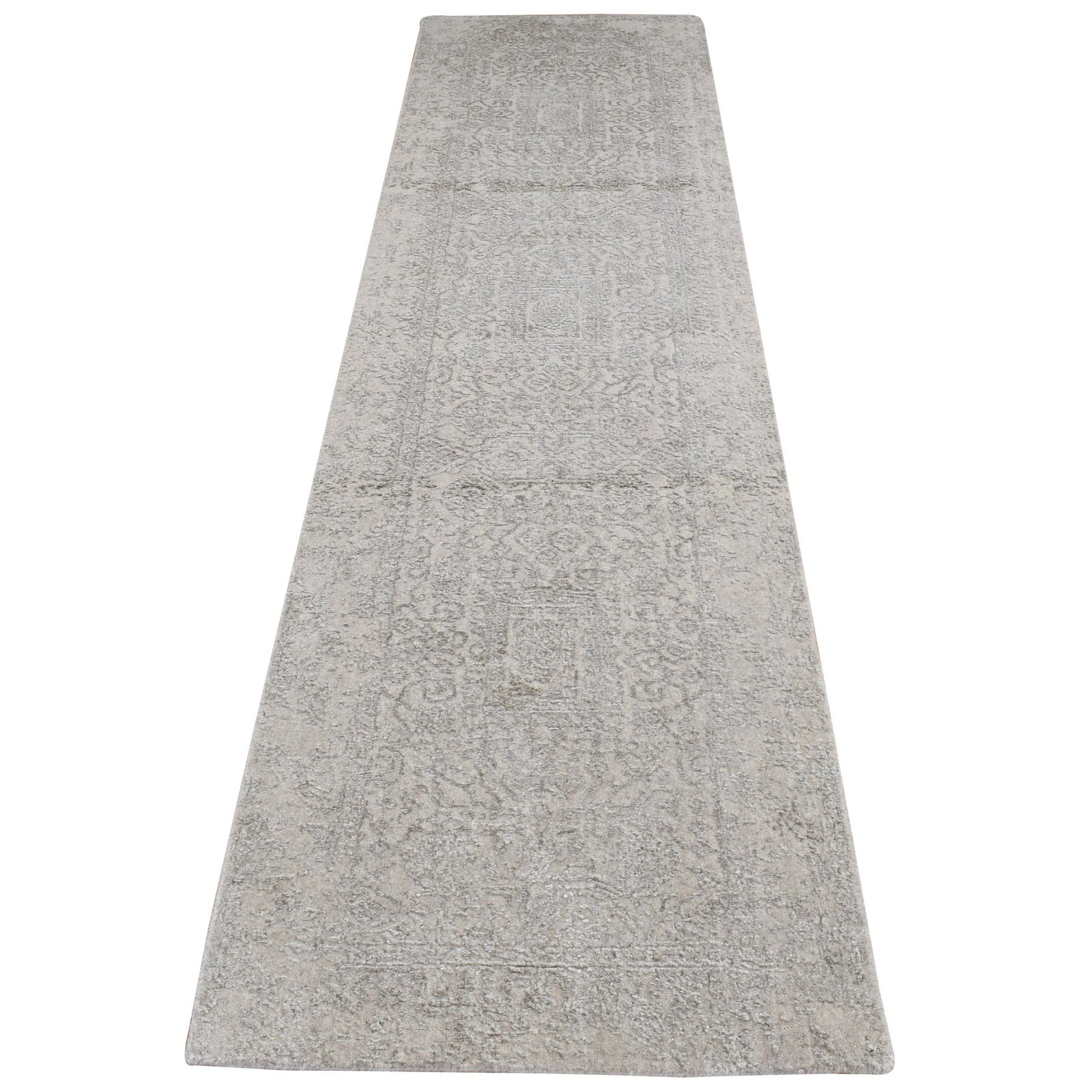 2'5"X10' White, Wool And Silk, Fine Jacquard Hand Loomed Runner Rug