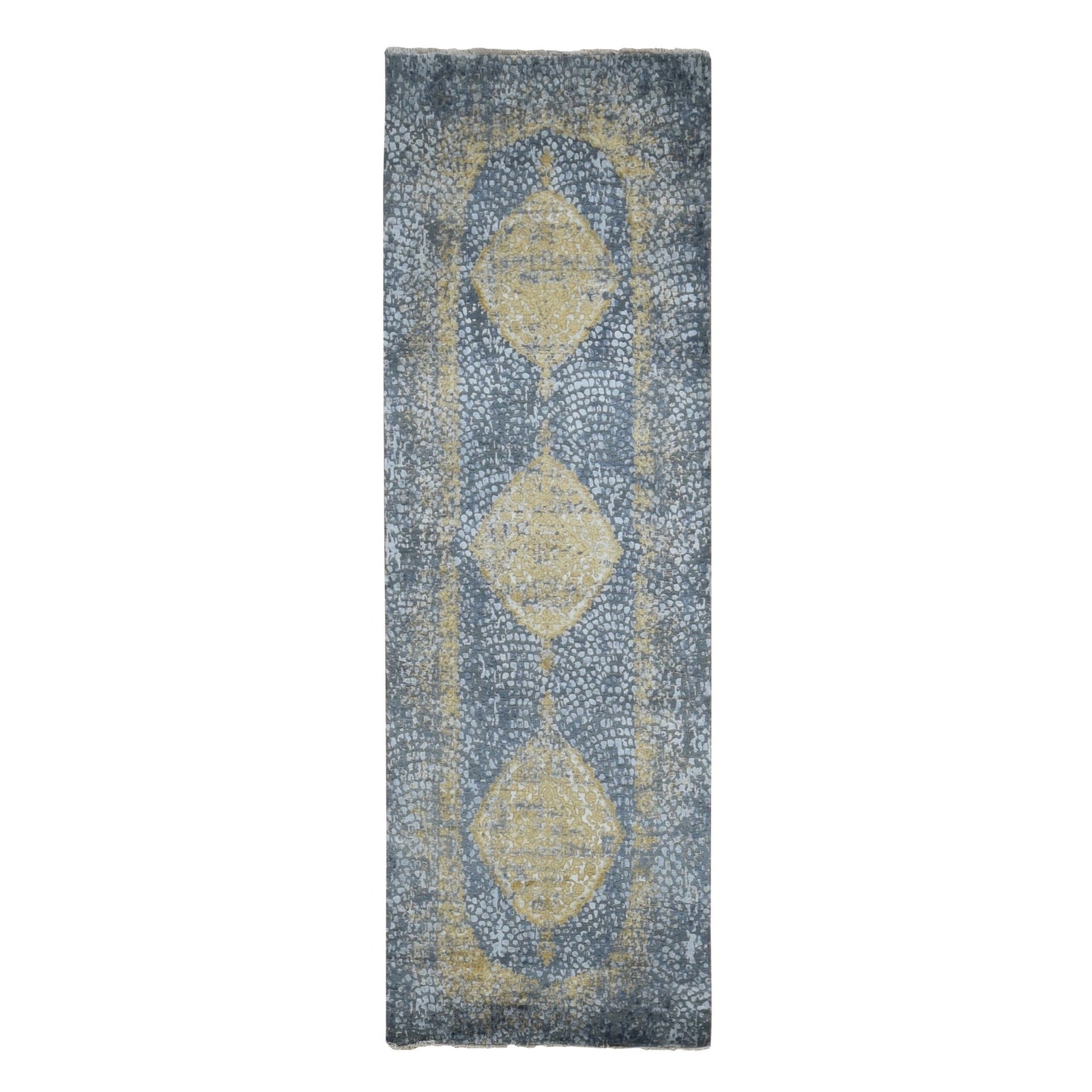 3'2"X9'10" Gray Zoroastrian Design Wool And Silk Runner Hand Knotted Rug