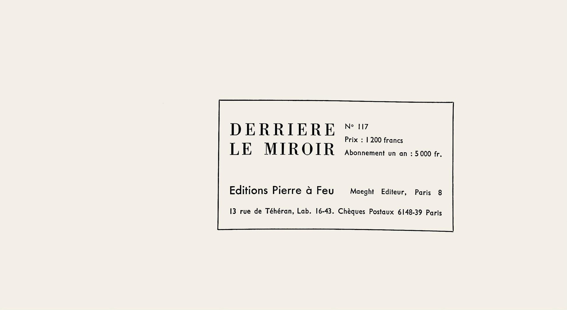 The name, Derrire le Miroir was suggested by Jacques Kober, manager of Galerie Maeght.