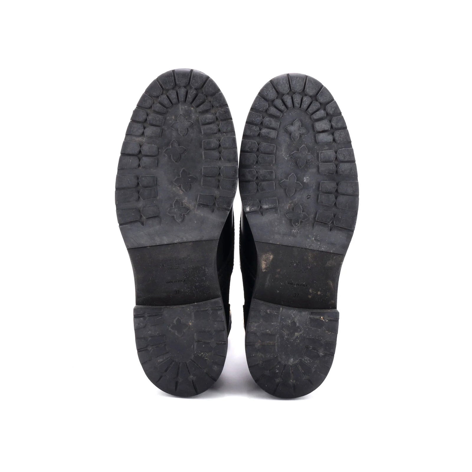 Condition: Very good. Odor in interior. Creasing and scuffs throughout, discoloration and marks in interior, faded insole logos, peeling, discoloration, scuffs, and minor nicks on outer soles, scratches on hardware.