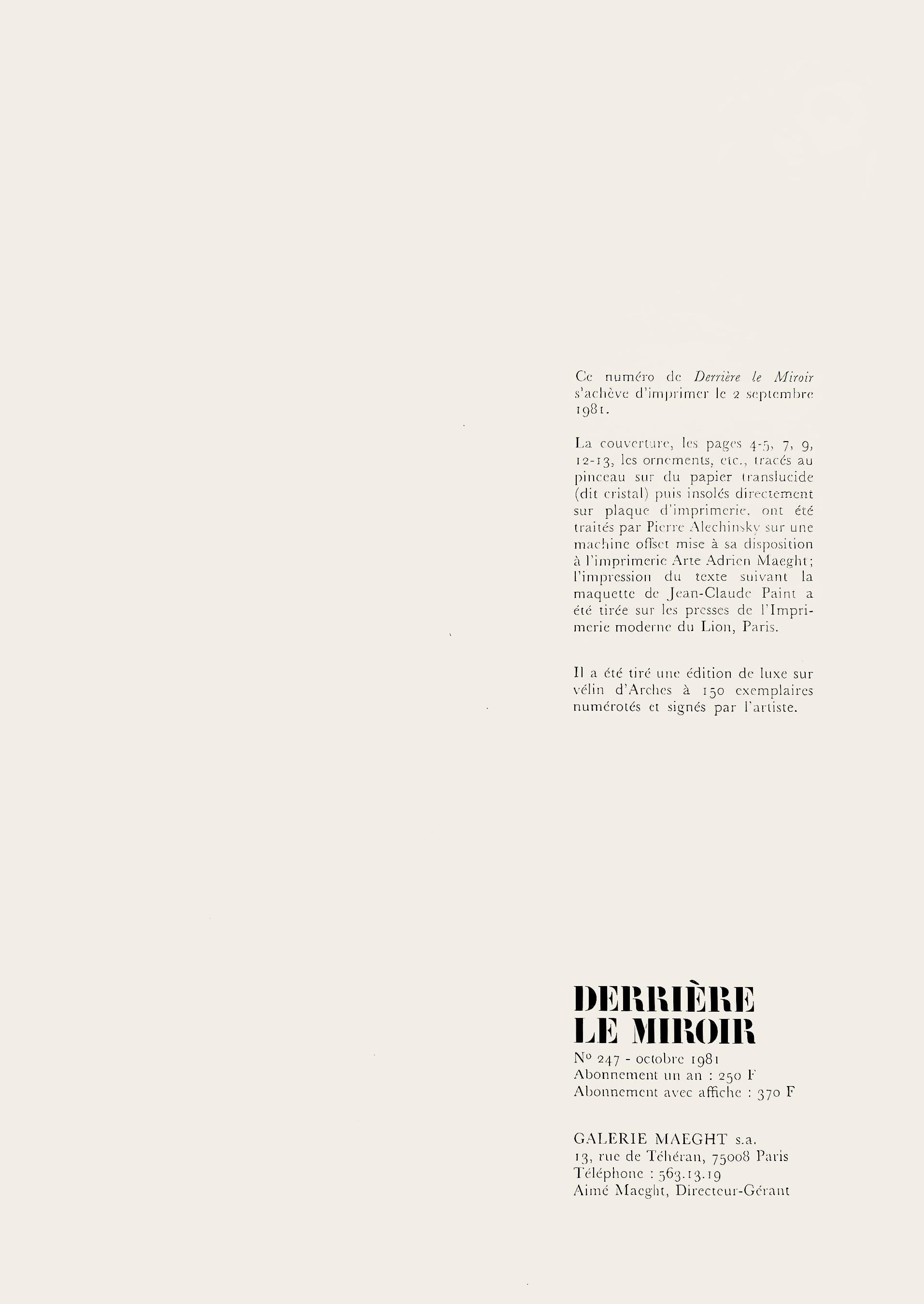 It was published after number 253 in 1982 and became a tribute to Aim and Margurite Maeght and 35 years of friendship with artists and poets. The era of Derrire le Miroir was closed with that final publication.
