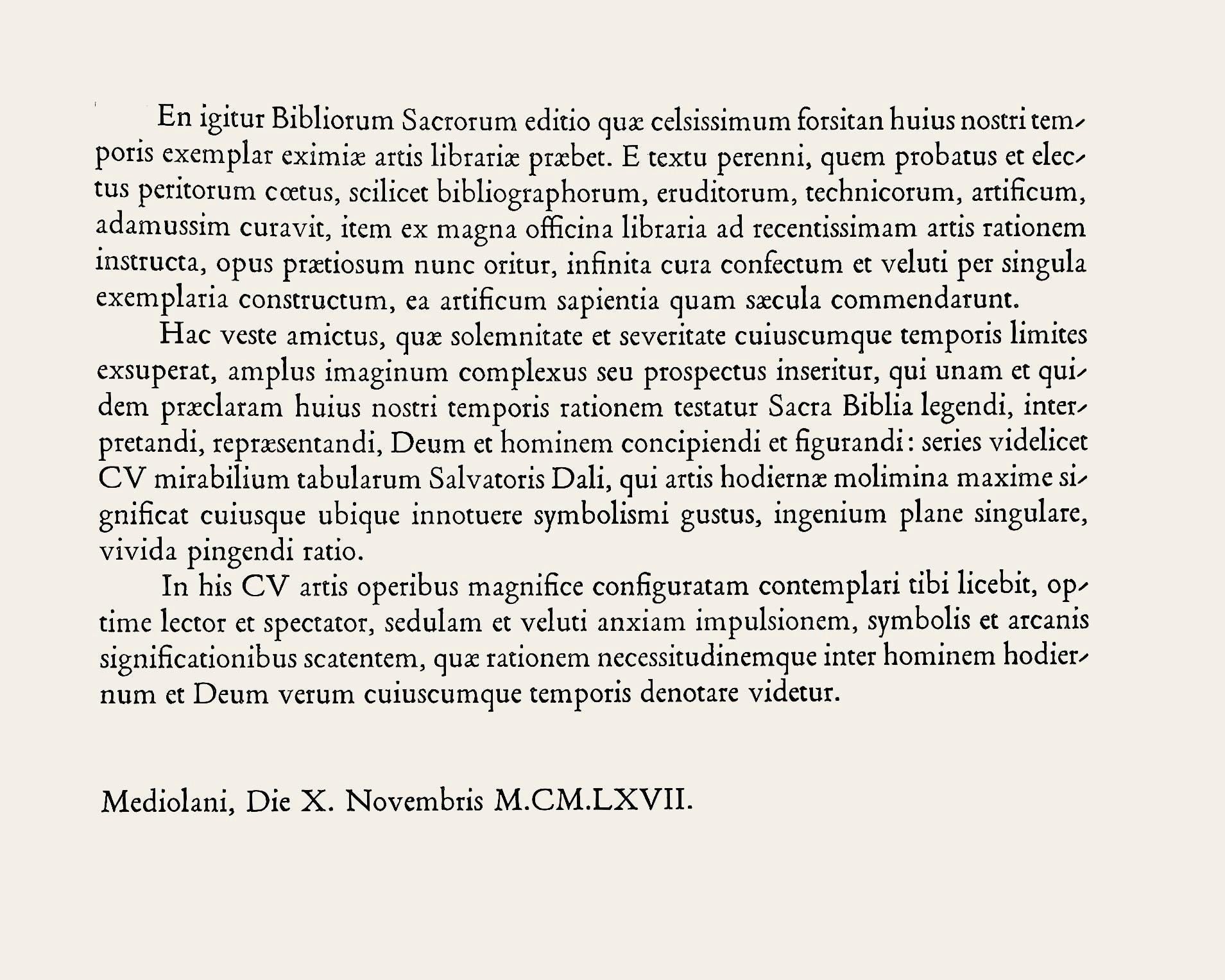 Dressed in this garment, which surpasses the limits of any time with its solemnity and severity, a vast complex or perspective of images is inserted, which attests to one and the same excellent way of reading, interpreting, representing, conceiving and depicting the Biblia Sacra, God and man: namely, a series of L wonderful paintings by Salvador Dali, who is the greatest example of modern art, whose taste for symbolism, his unique talent, and his vivid style of painting are everywhere noticeable.
