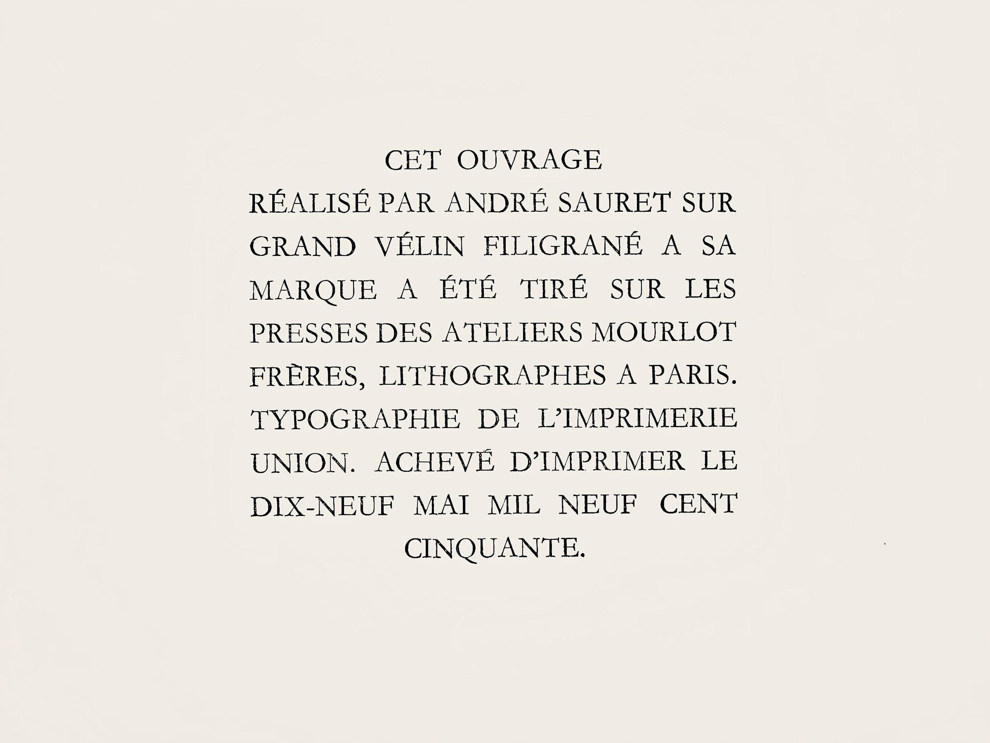 Excerpted from the folio (translated from French), This album, directed by Andr Sauret, on grand vlin Filigran a sa marque, was drawn on the presses of the ateliers Mourlot Frres, lithographs in paris.