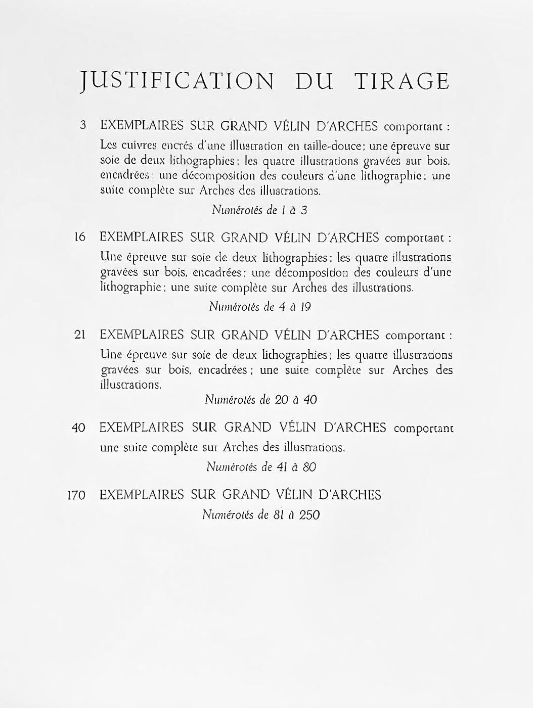 Justification of the draw: 3 examples on grand vlin dArches with the inked coppers of an illustration in taille-douce; a silk test of two lithographs; the four illustrations engraved on wood, framed; a decomposition of the colors of a lithograph; a complete suite on Arches of the illustrations, numbered 1-3.