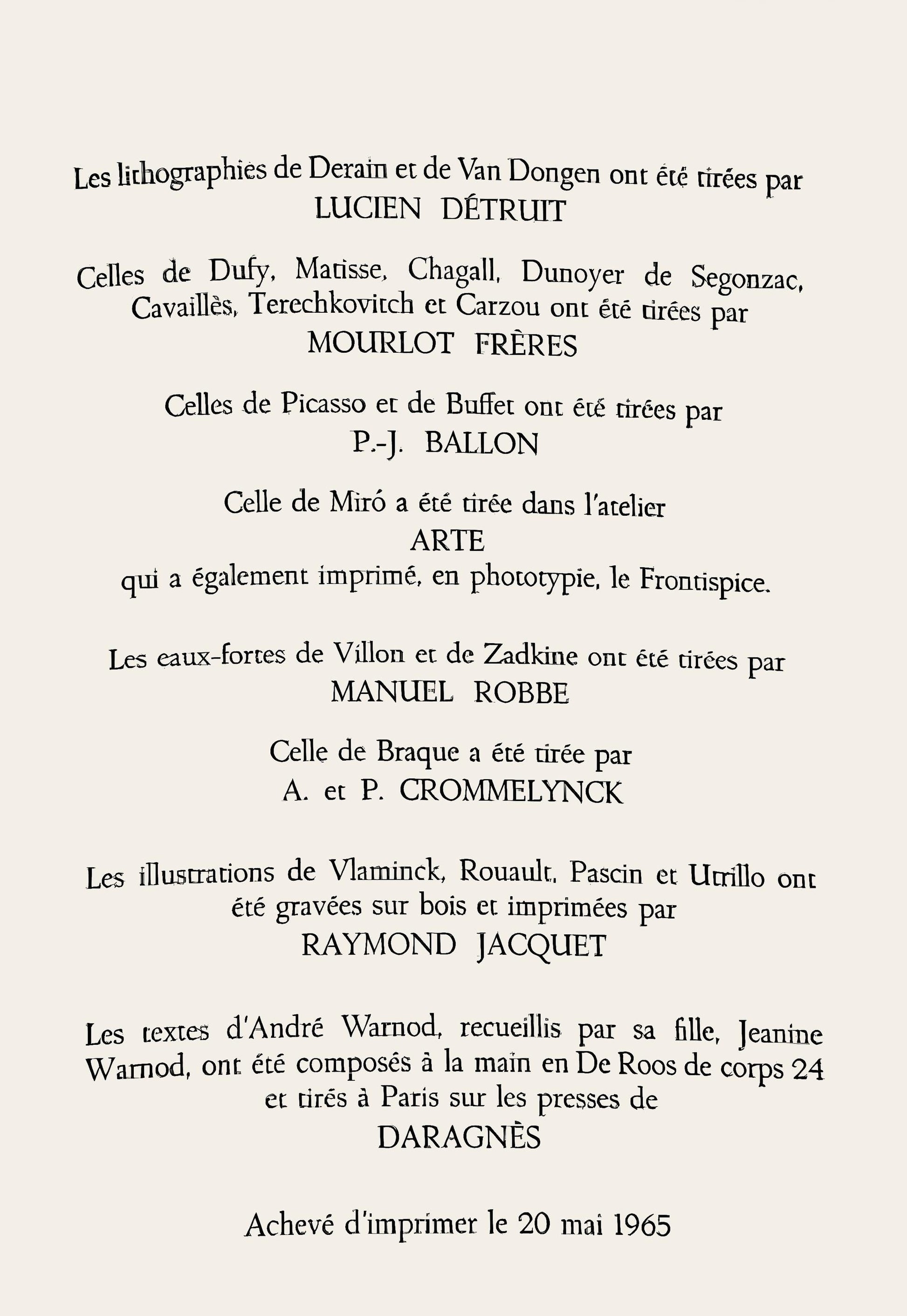 Excerpted from the volume (translated from French), The lithographs of Derain and Van Dongen were shot by Lucien Dtruit; those of Dufy, Matisse, Chagall, Dunoyer de Segonzac, Cavailles, Terechkovitch and Carzou were shot by Mourlot Frres; those of Picasso and Buffet were shot by P.J.