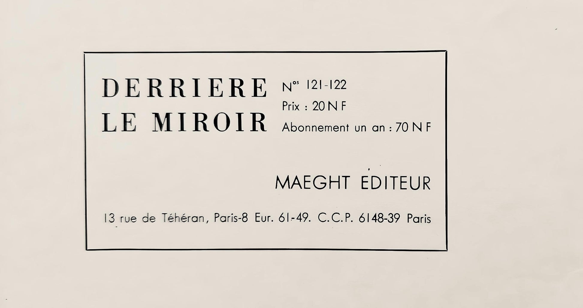 Aim Maeght, initiator of Derrire le Miroir, had already made few attempts to start publications illustrated with fine printed lithographs in colours in the years prior to the launch of Derrire le Miroir.