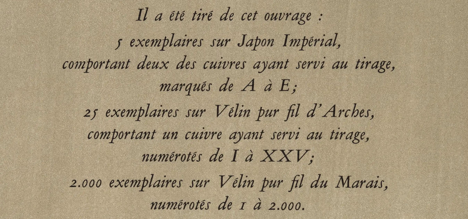 Published by Ren Drouin, diteur, Paris; printed by Drager Frres, Matres-Imprimeurs, Paris, 1947. Excerpted from the folio (translated from French), It was taken from this album: V examples on Japon Imprial, including II of the brasses used in the print run, marked from A to E; XXV examples on Vlin pur fil d'Arches, including a cure used for the print run, numbered from I to XXV; MM examples on Vlin pur fil du Marais, numbered from I to MM.
