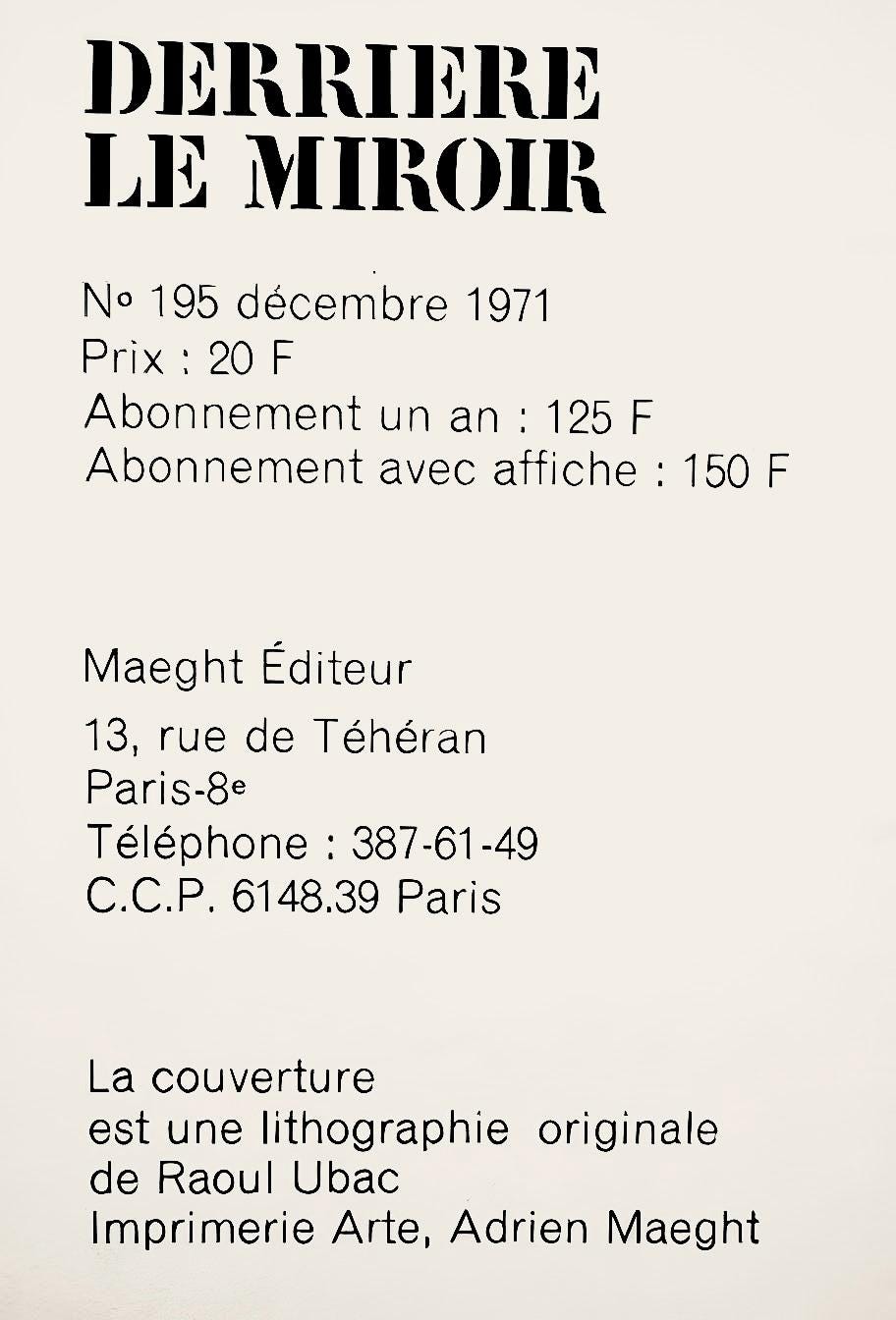 Aim Maeght, initiator of Derrire le Miroir, had already made few attempts to start publications illustrated with fine printed lithographs in colours in the years prior to the launch of Derrire le Miroir.
