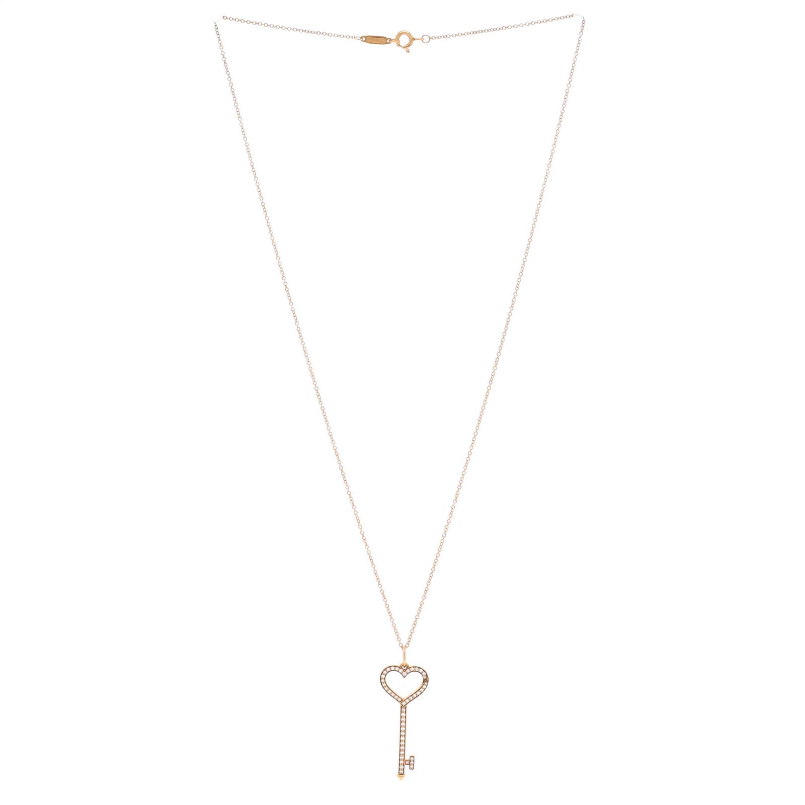 This listing features Diamonds Tiffany & Co. Open Heart Key Pendant Necklace 18K Rose Gold with Pave. Item specifics are provided below.
