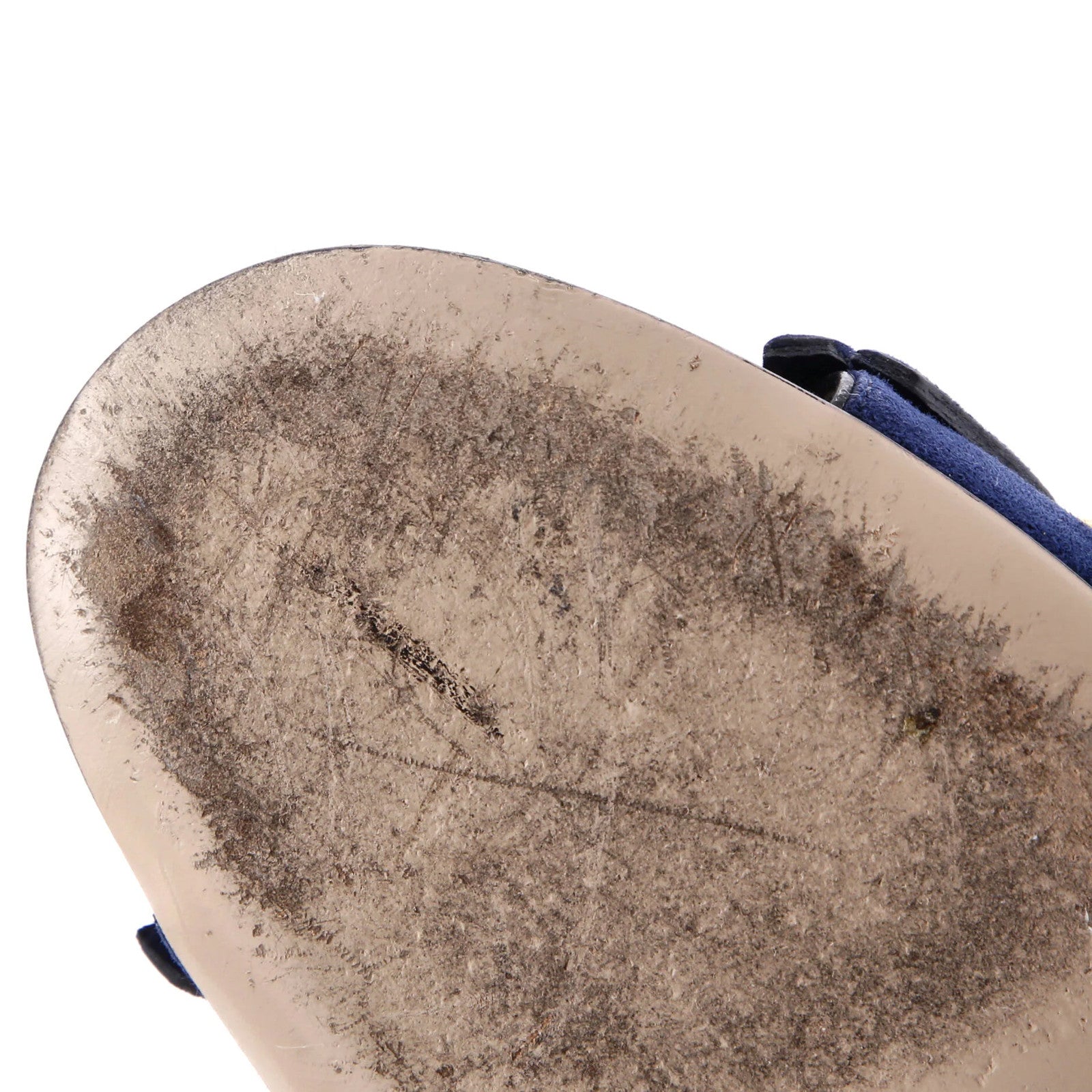 Condition: Very good. Creasing, darkening, and marks throughout, moderate peeling, darkening, and scuffs on outer soles, scratches on hardware.