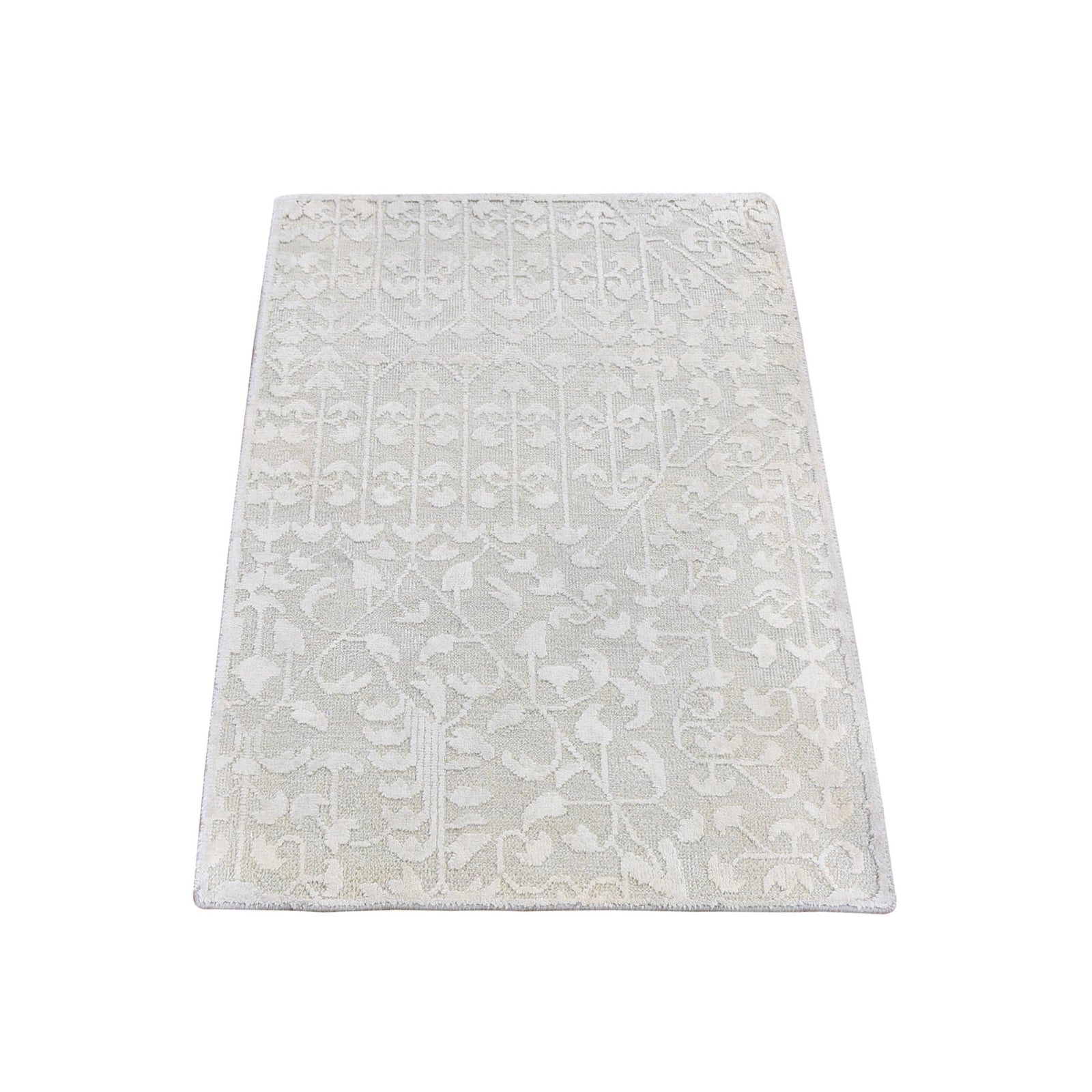 Rug 2'x3'4" Ivory Hand Knotted Pure Silk with Textured Wool Tone on Tone