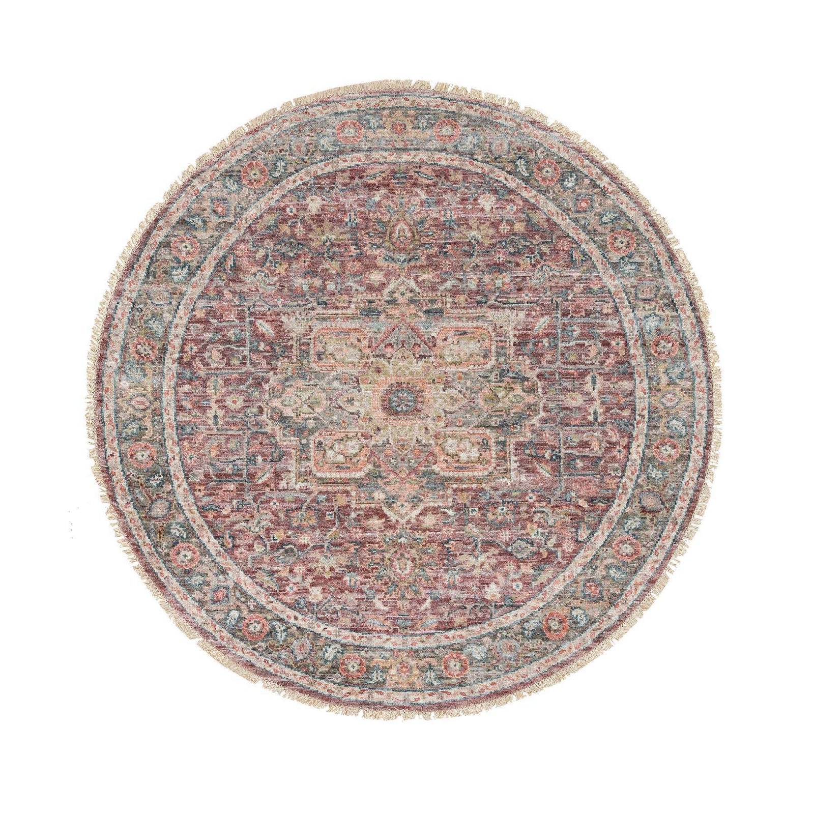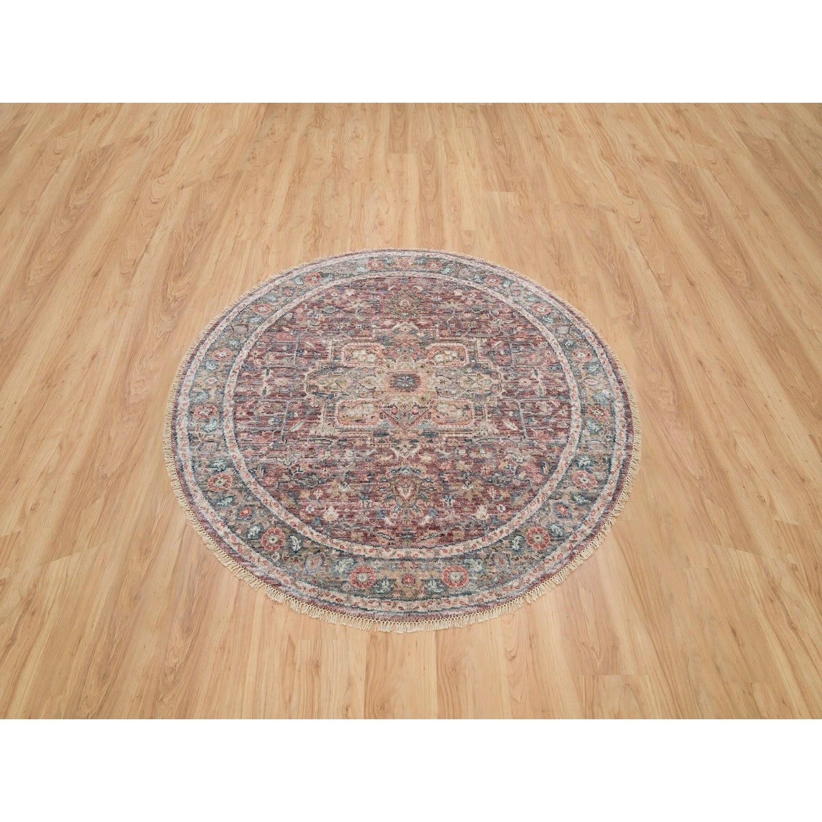Rug 6'x6' Sangria Red Hand Knotted Pure Wool Heris Revival Round Oriental