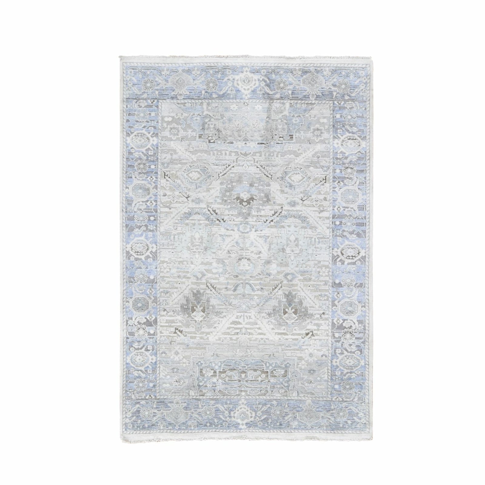 4'X6'2" Gray Pure Silk & Textured Wool Oushak Geometric Motif Rug