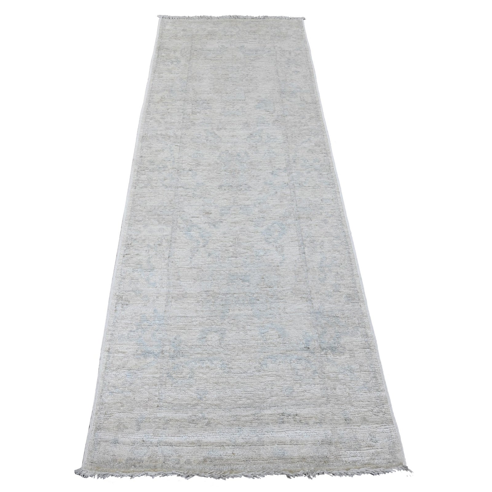 2'8"X7'10" White Hand Knotted Afghan Angora Oushak Pure Wool Runner Rug