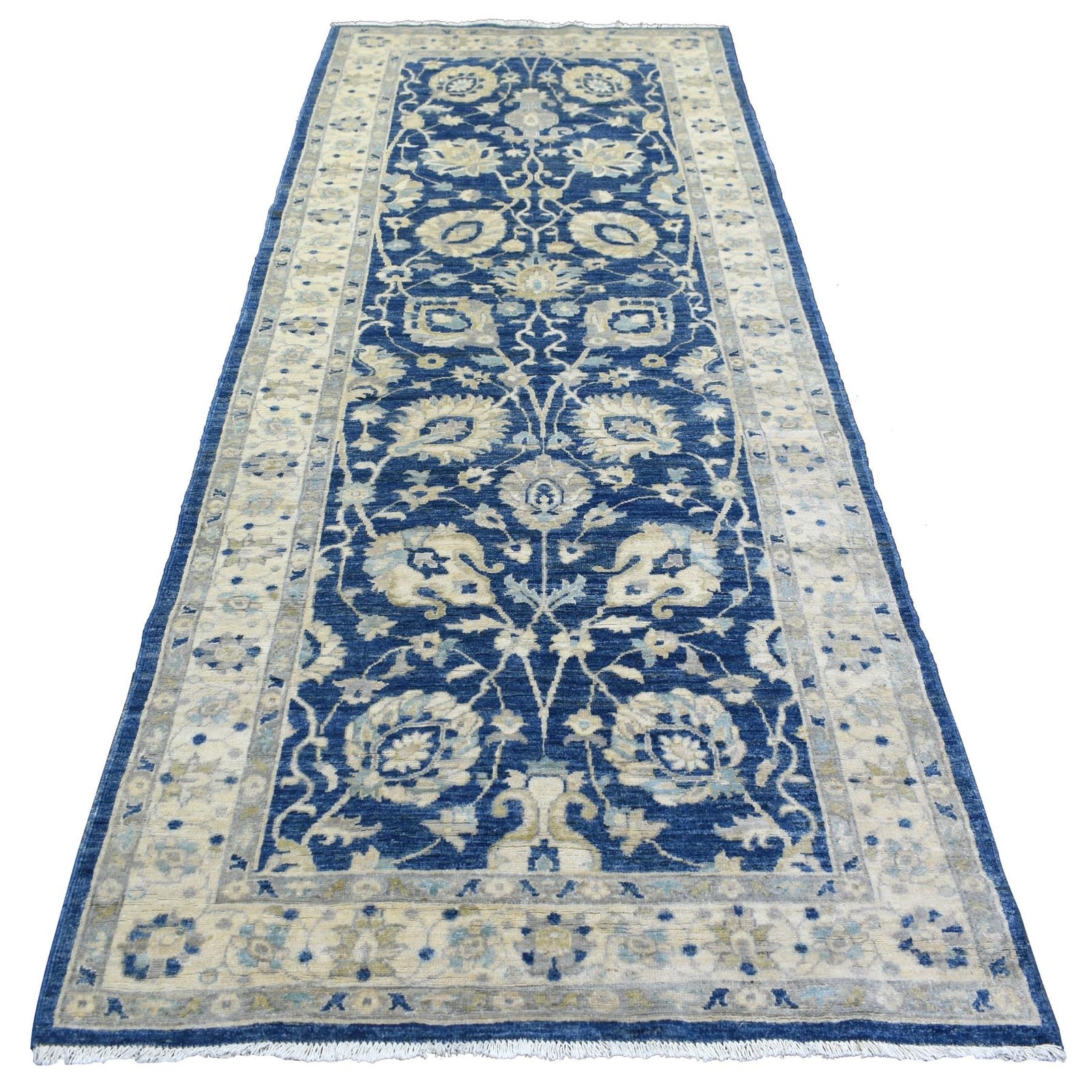 4'X10'3" Denim Blue Hand Knotted Fine Peshawar Wool Wide Runner Rug
